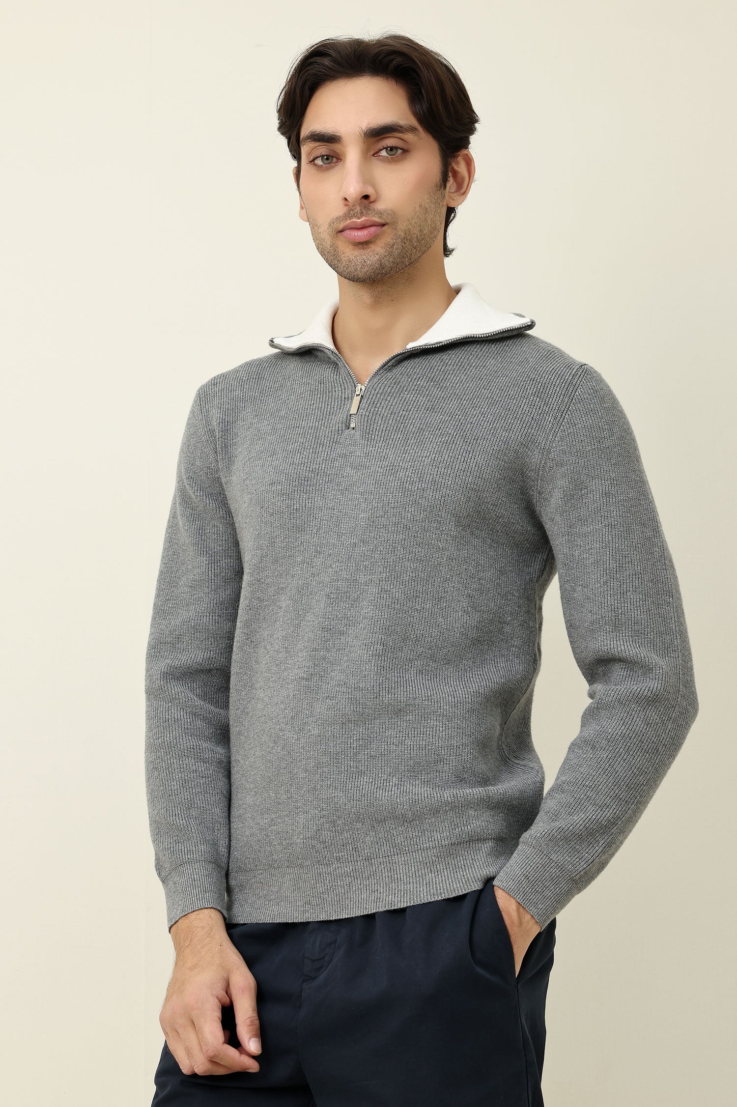 The knit texture presents a crisp, structured surface with subtle vertical ribbing that adds dimension to the shape. A quarter-zip collar detail provides versatile styling options while preserving a clean, minimal aesthetic. This piece is built for everyday wear and layering, combining timeless elegance with durable construction.