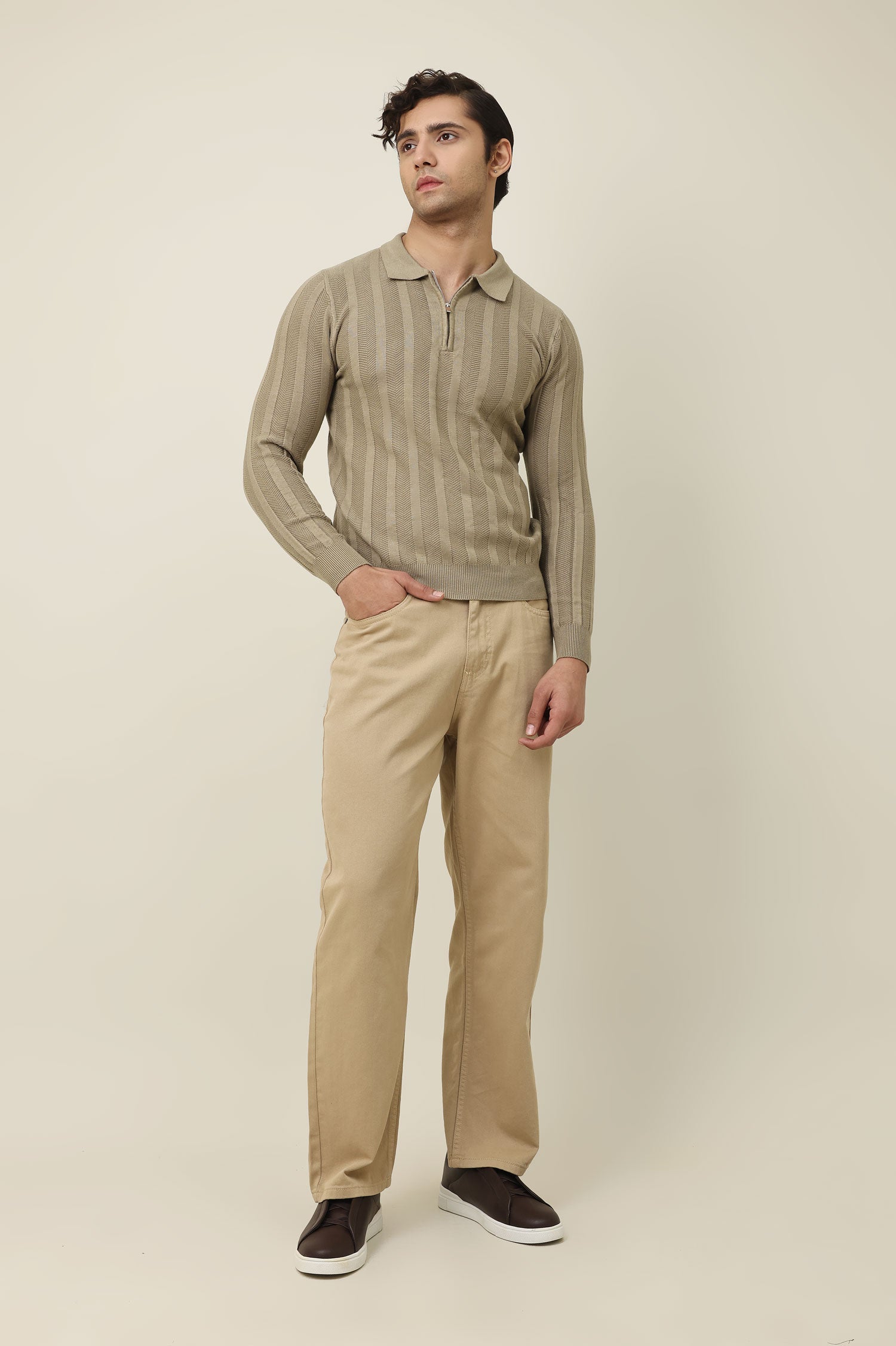 Expertly crafted for both comfort and sophistication. This versatile piece features a soft, breathable fabric. The classic crew neckline and ribbed cuffs add a touch of timeless elegance, while the neutral beige hue effortlessly complements a variety of outfits.