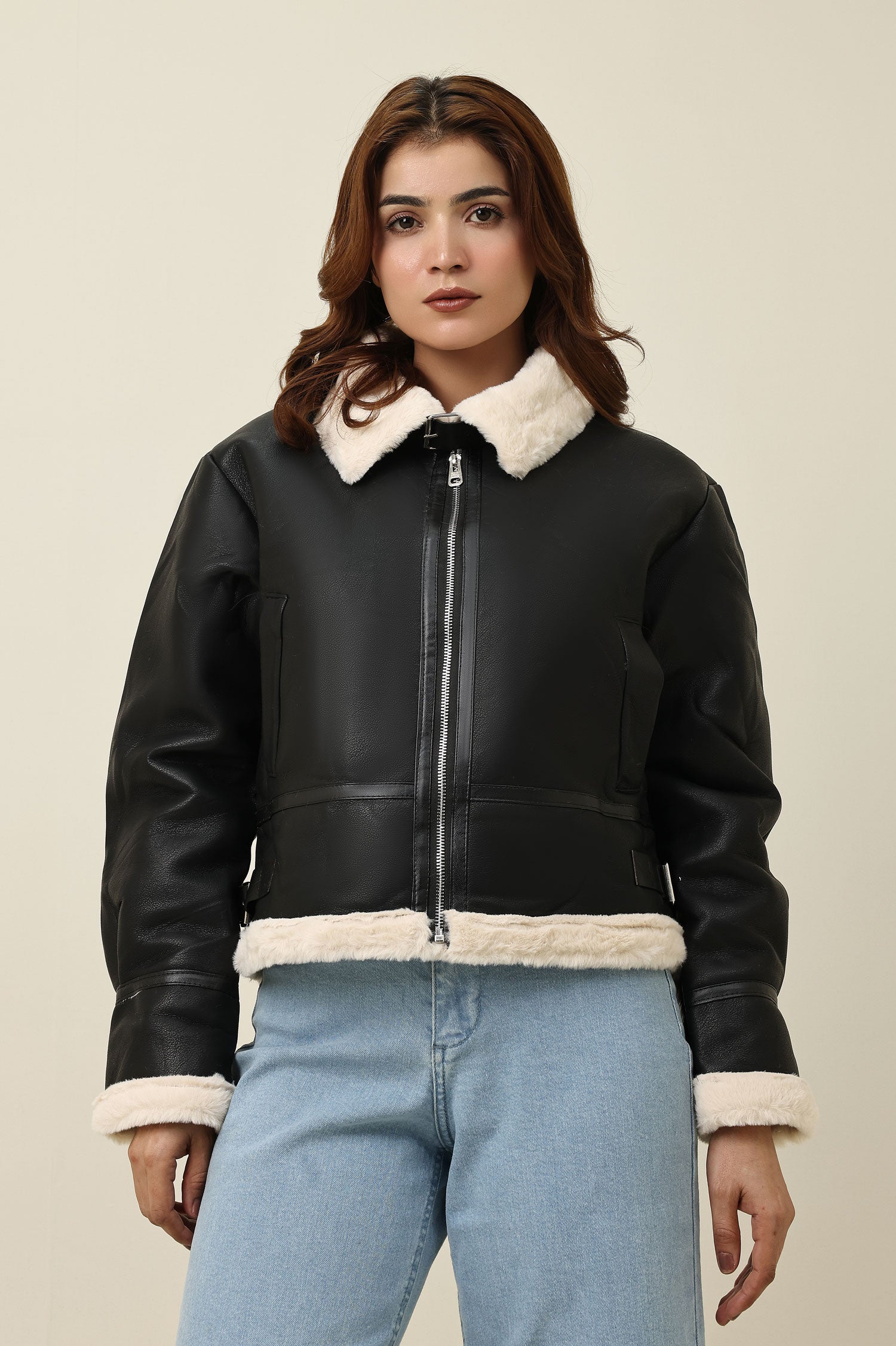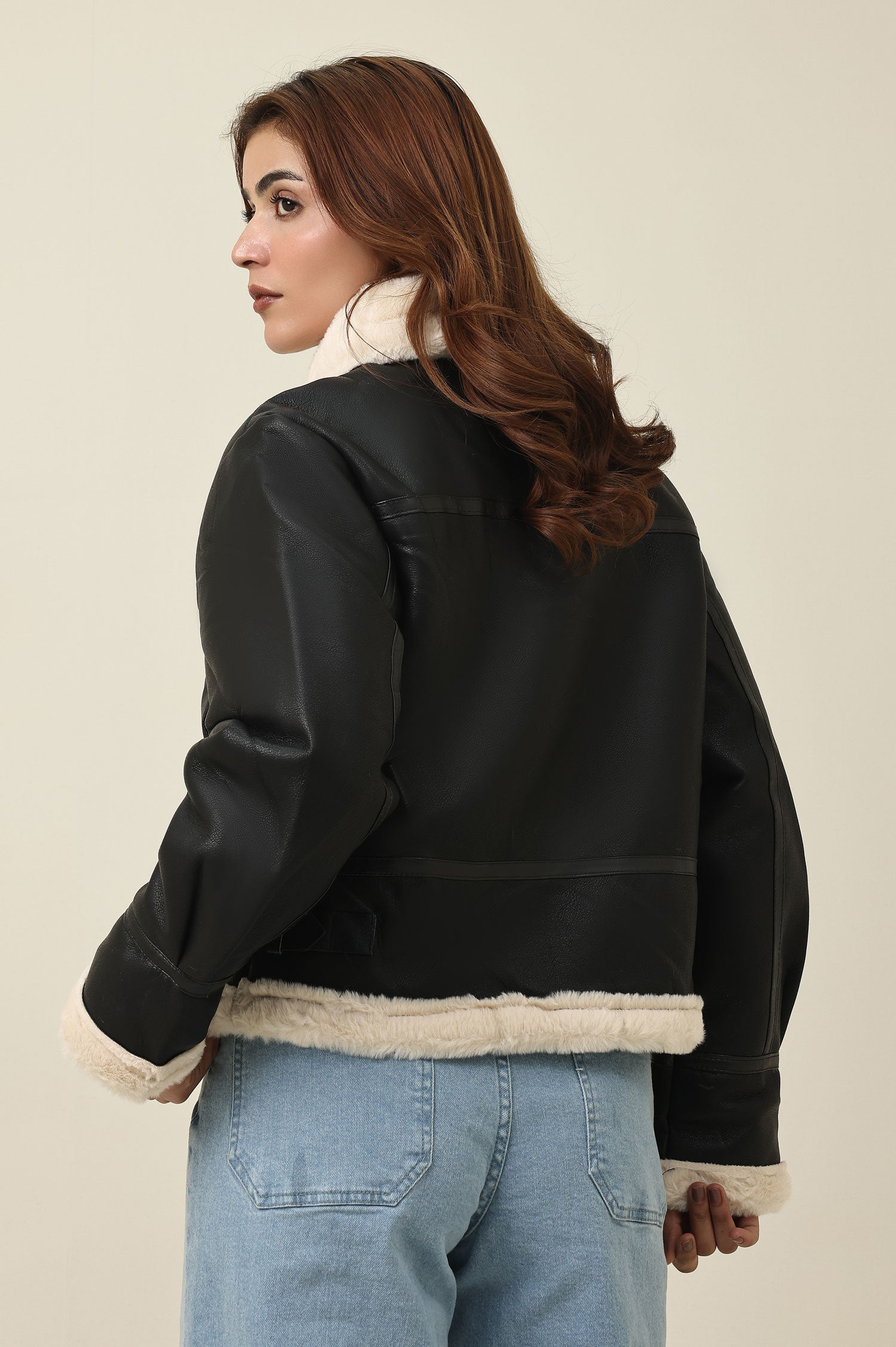 The jacket’s leather-textured surface enhances its strong, defined outline.