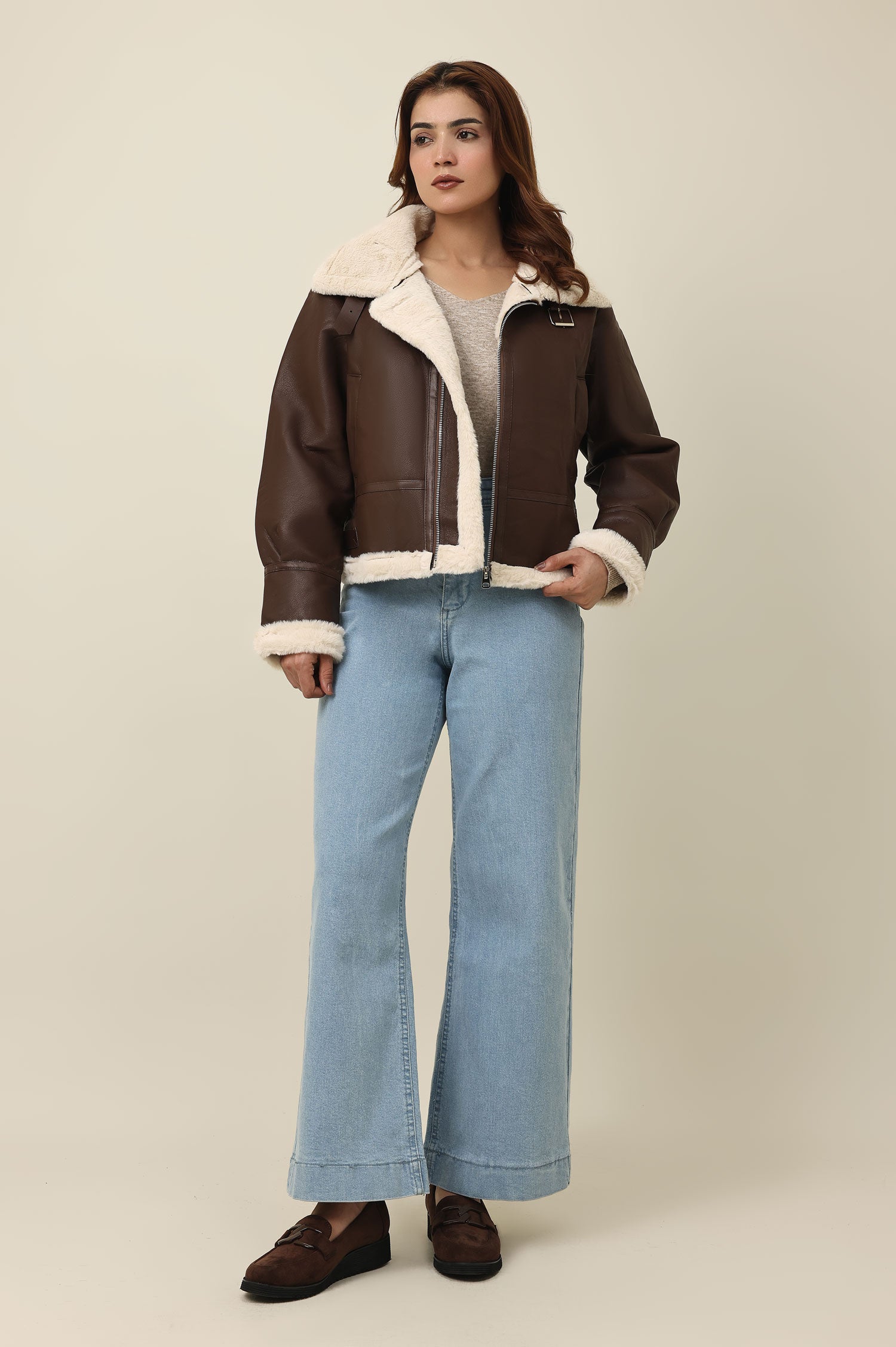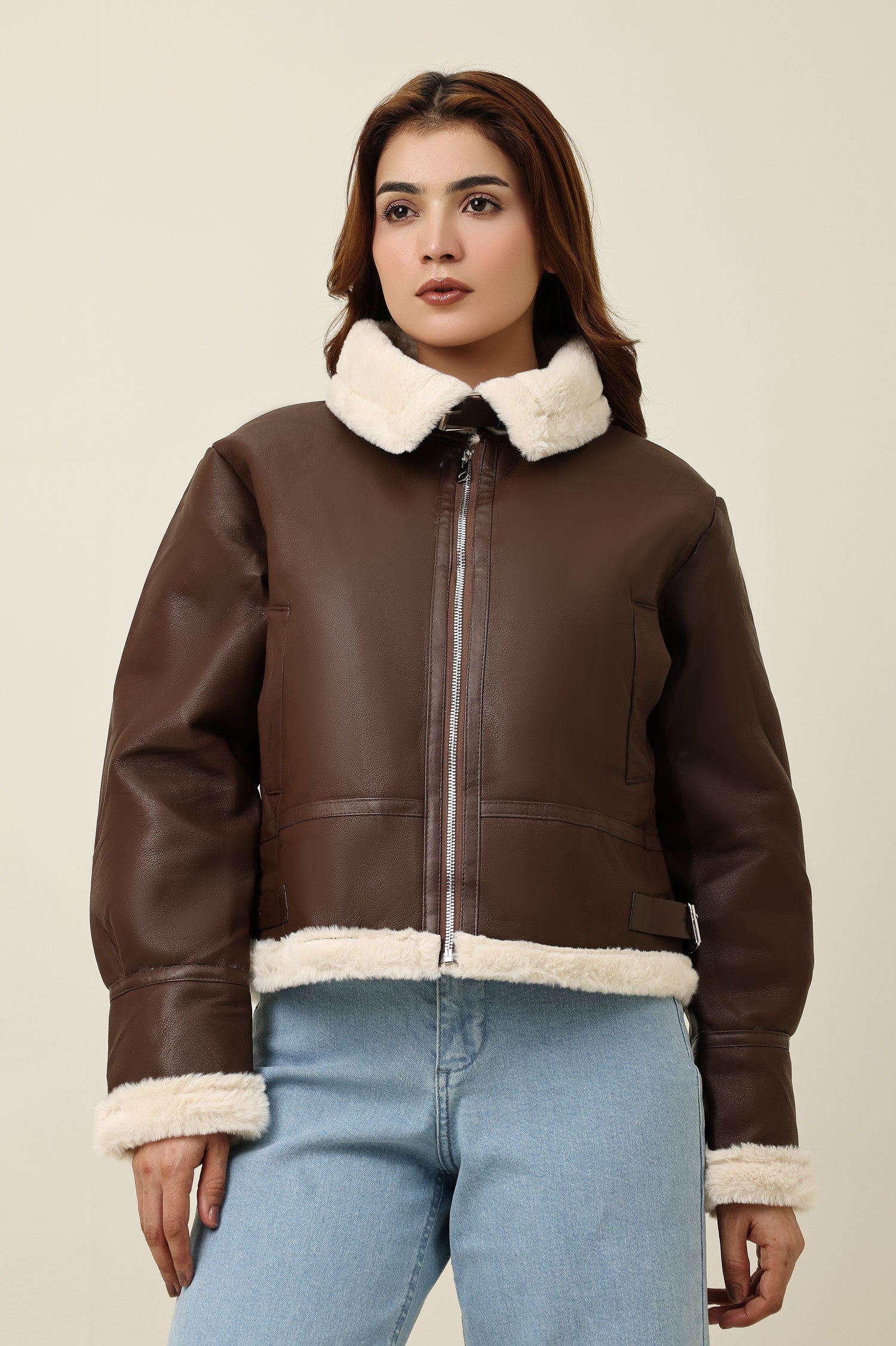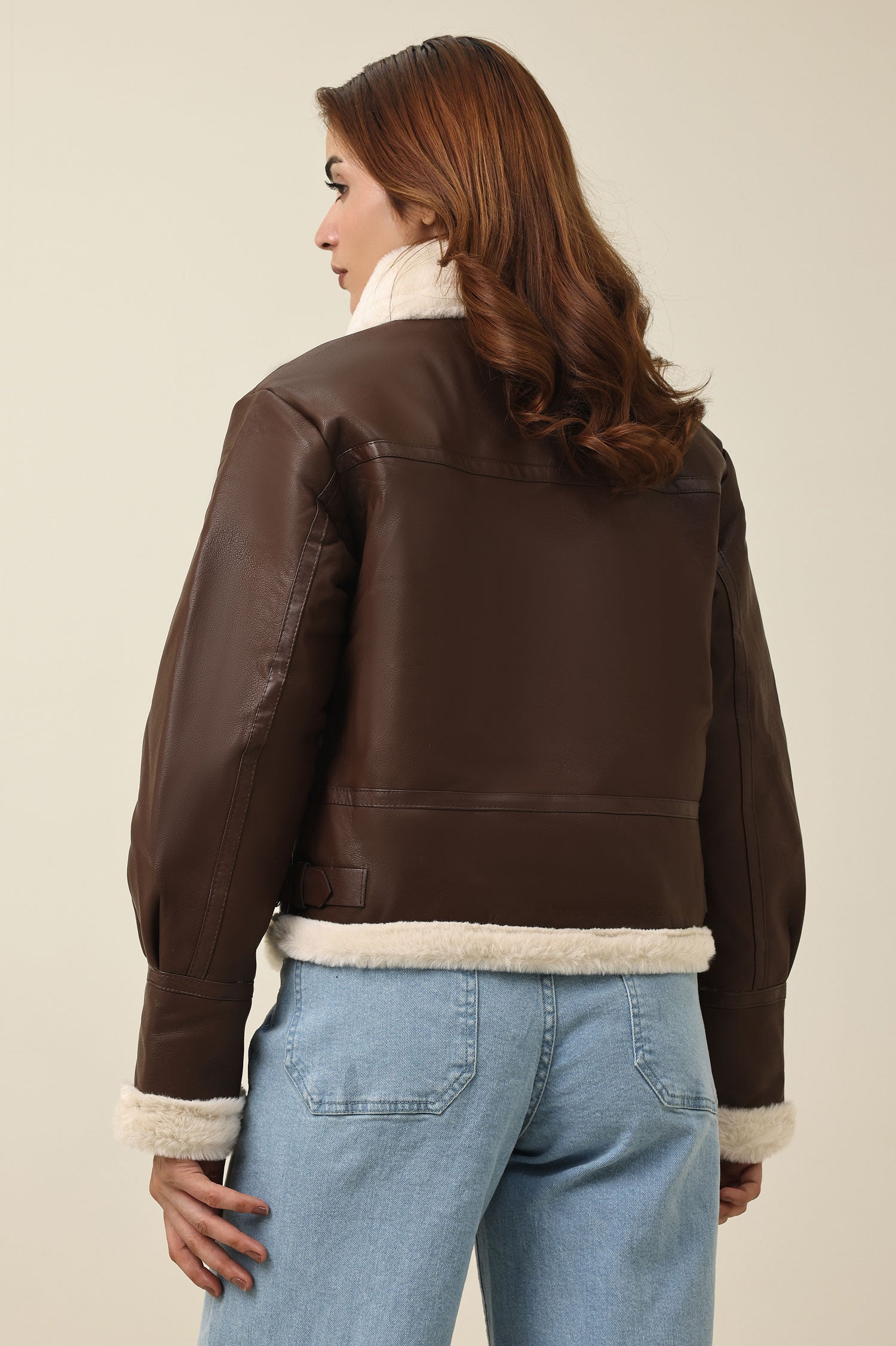The jacket’s leather-textured surface enhances its strong, defined outline.