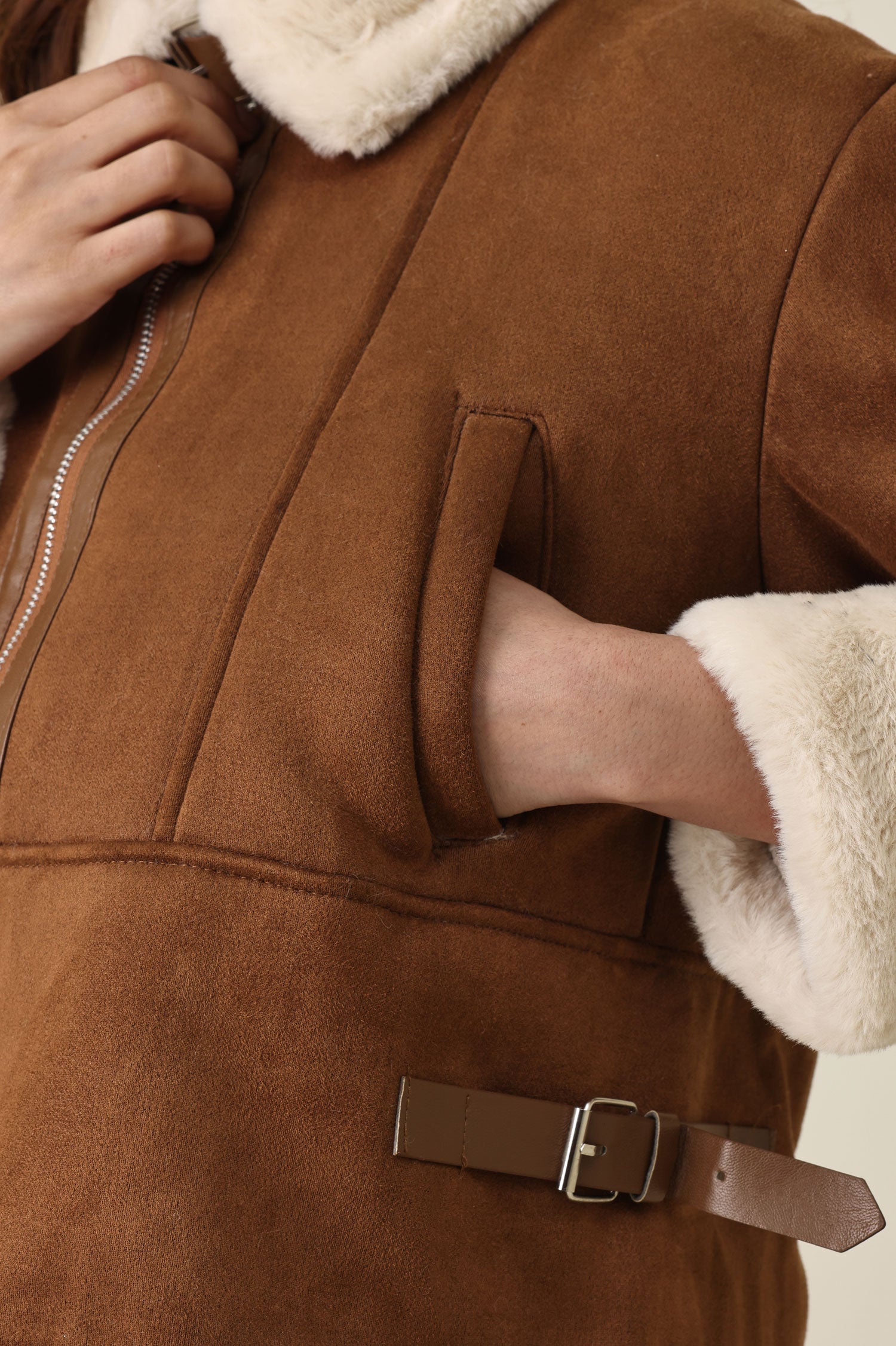 Faux shearling-lined collar and cuffs offer contrast to the suede-like body.