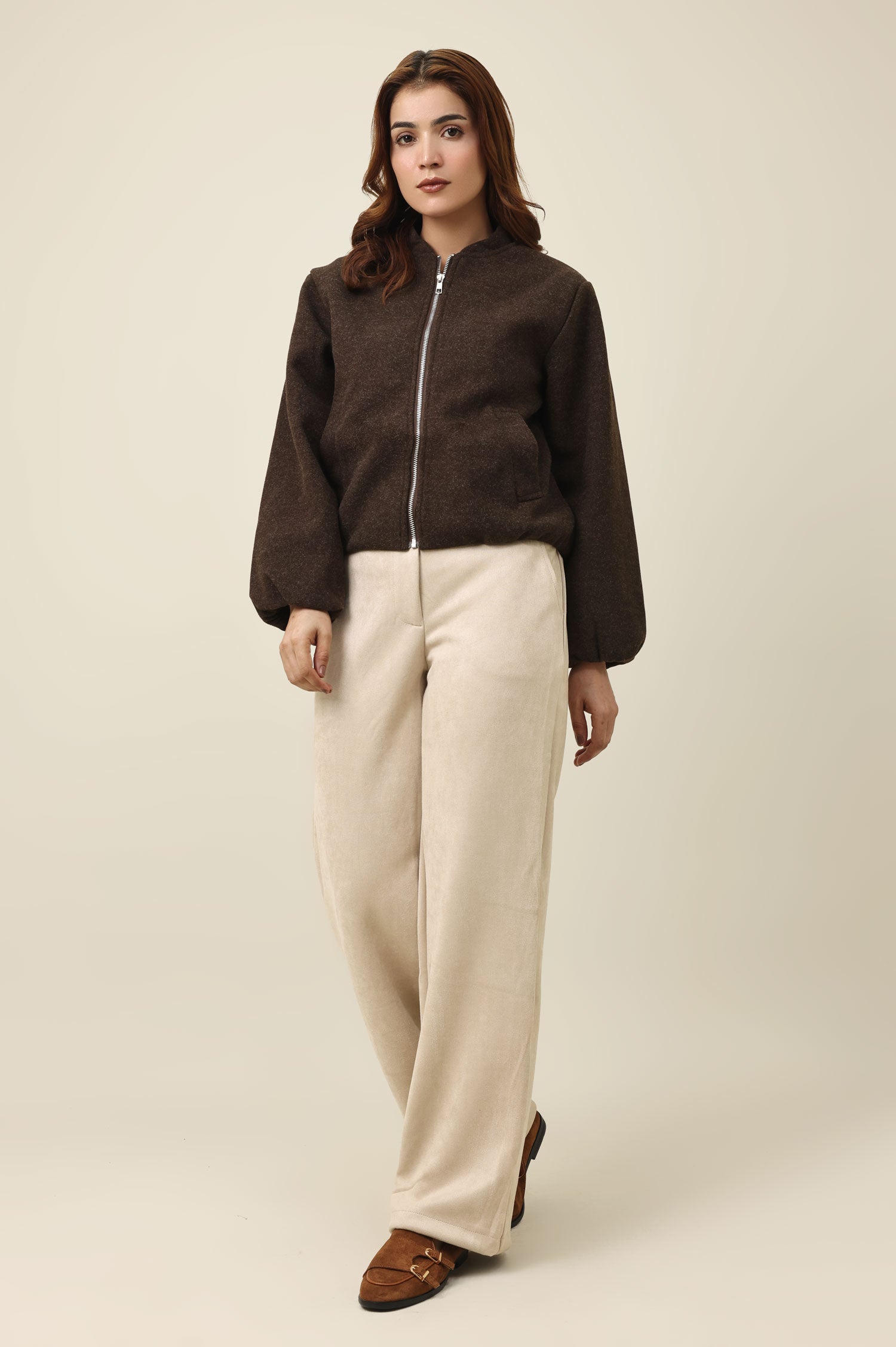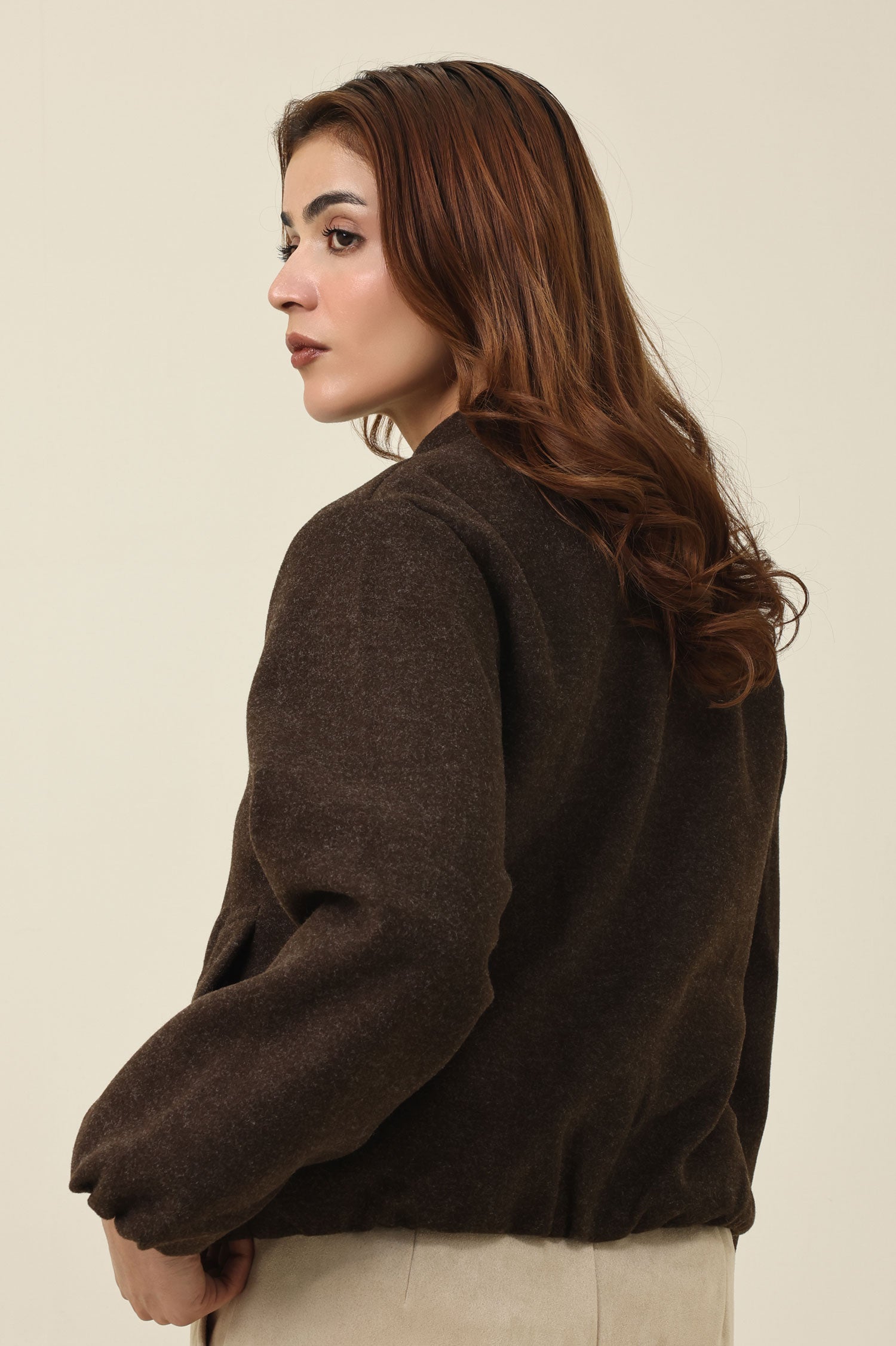 A structured, wool-inspired exterior gives the jacket a tailored yet casual edge.