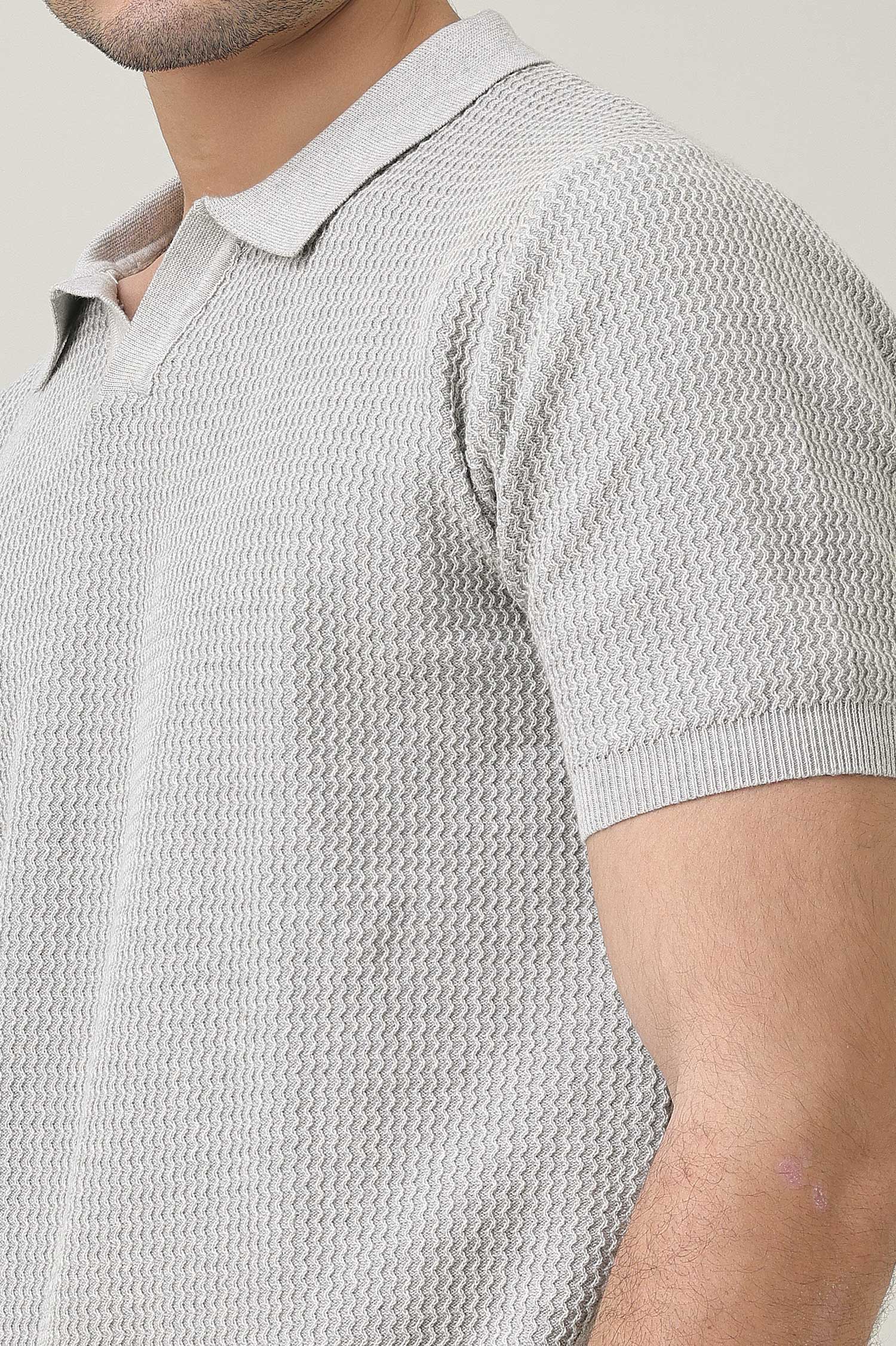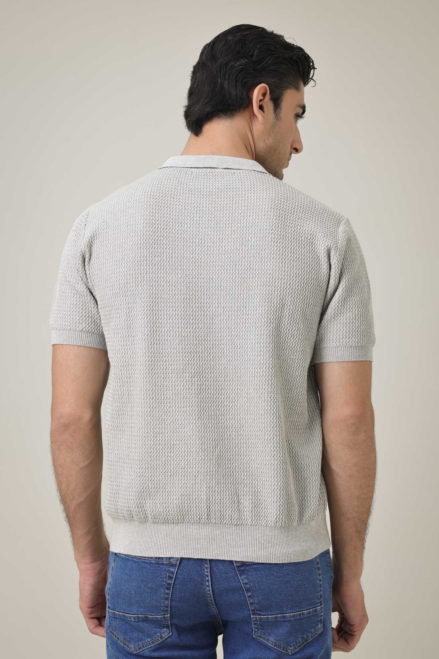 Short-sleeve style in a honeycomb knit fabric with rib trims.