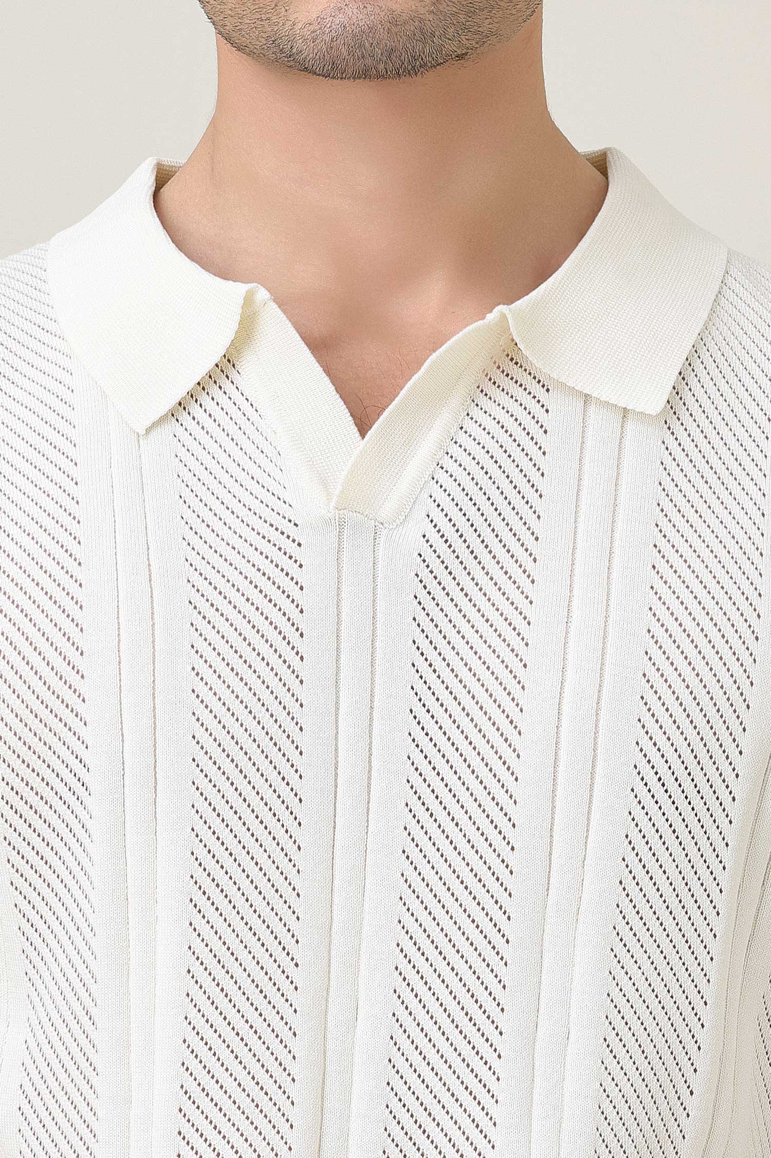 A textured vertical-knit polo, made for easy refinement. Lightweight feel meets structured fit, ideal for desk-to-dinner days. A modern twist on mid-century knitwear style.