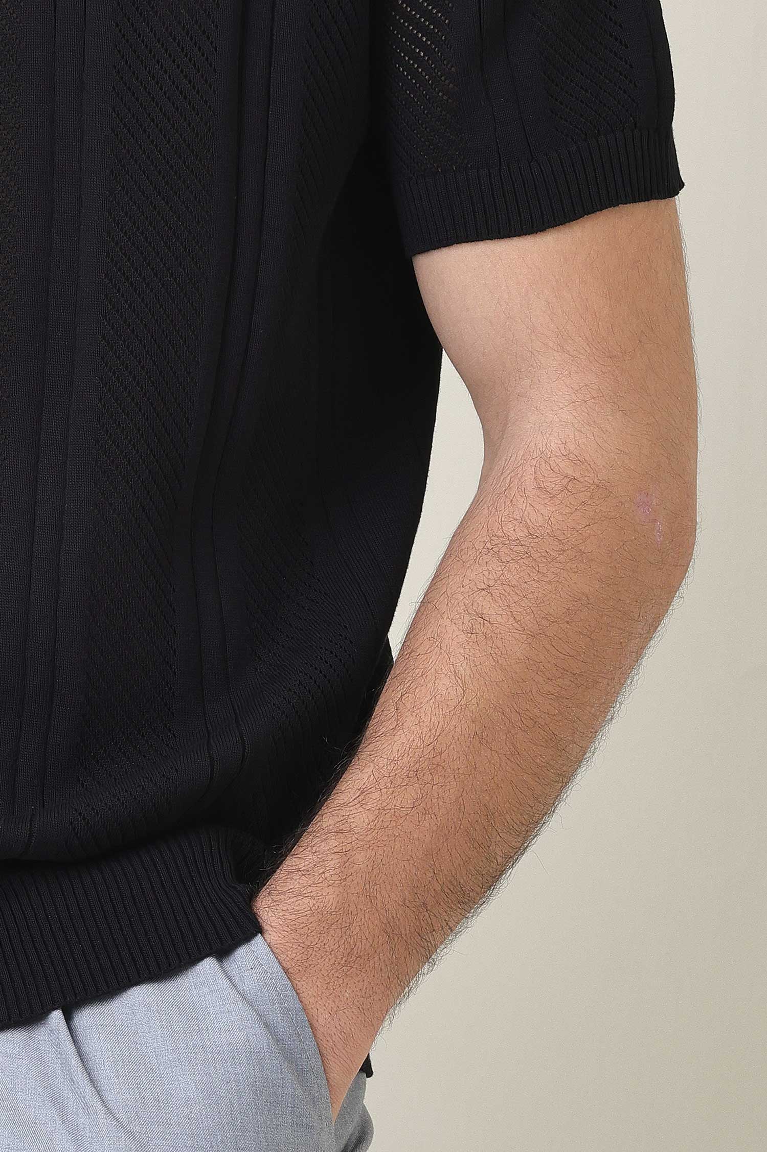 A textured vertical-knit polo, made for easy refinement. Lightweight feel meets structured fit, ideal for desk-to-dinner days. A modern twist on mid-century knitwear style.
