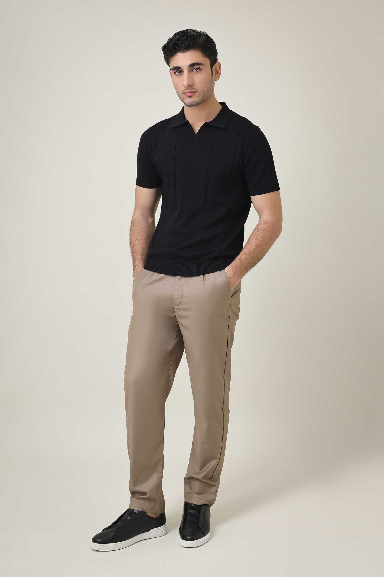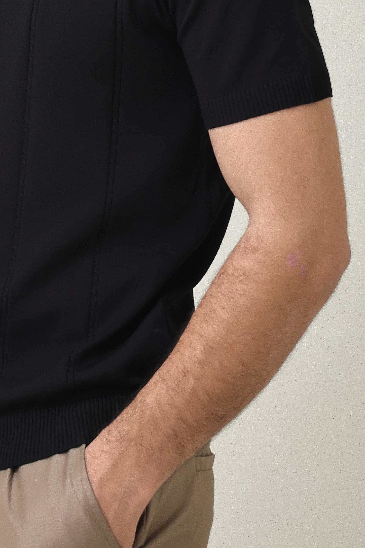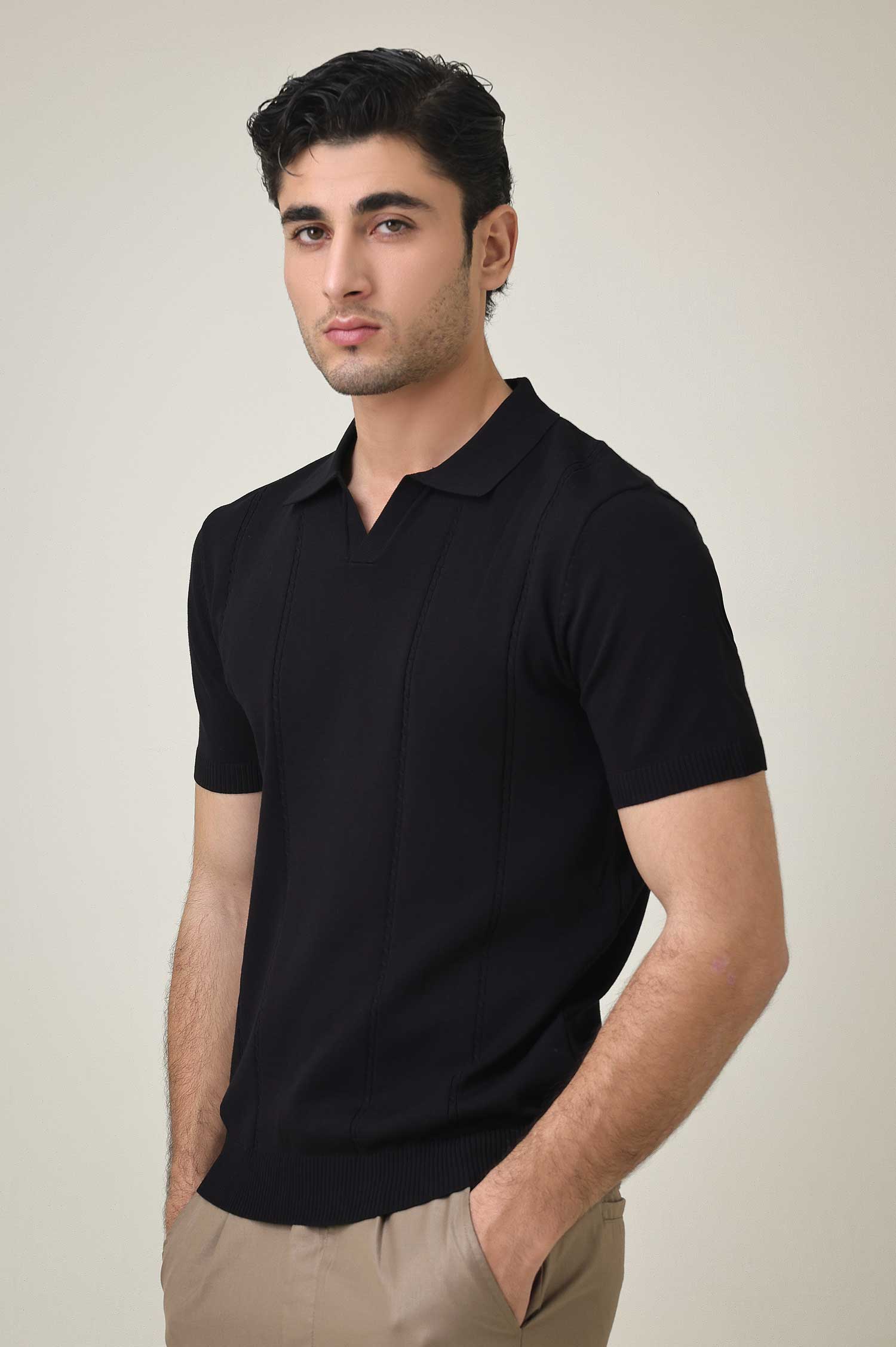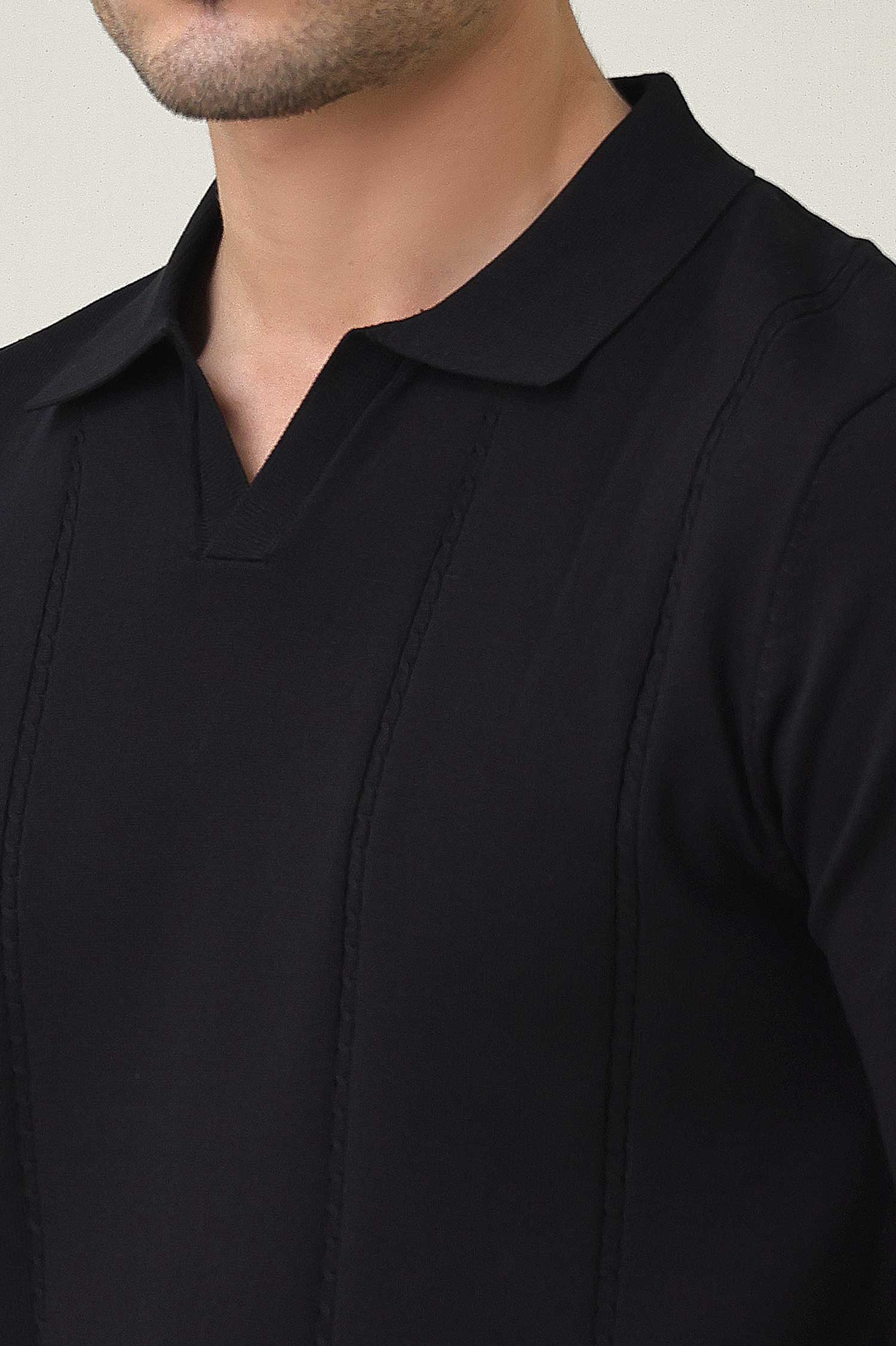 Showcasing soft linear textures in a sculpted knit, this collared shirt flatters with subtle rhythm. A minimal V-slit neckline adds a touch of contemporary detail. A versatile day-to-dusk piece.