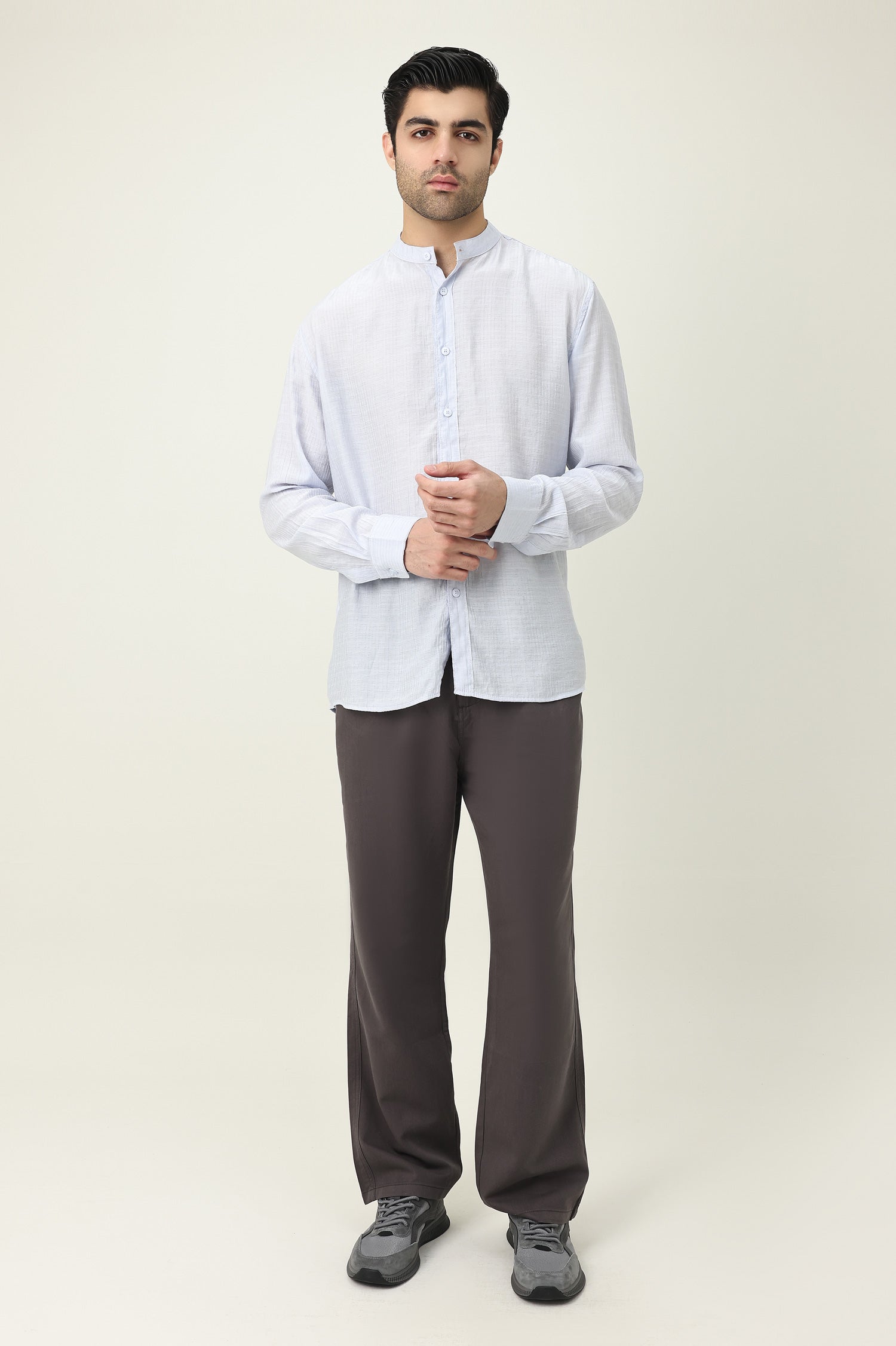 Band collar design adds a modern and minimalistic touch.