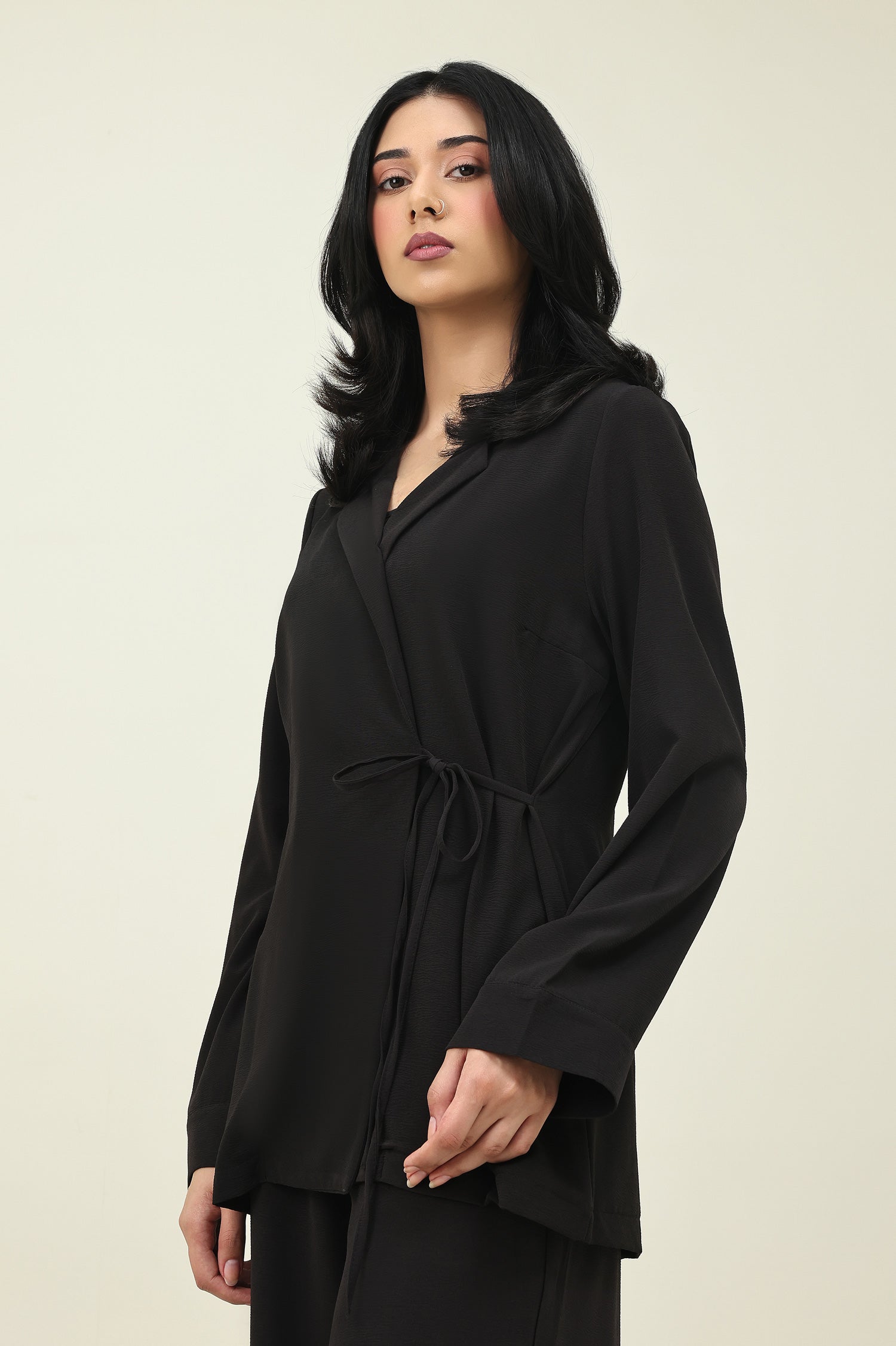 Structured collar with relaxed tailoring highlights contemporary styling.
