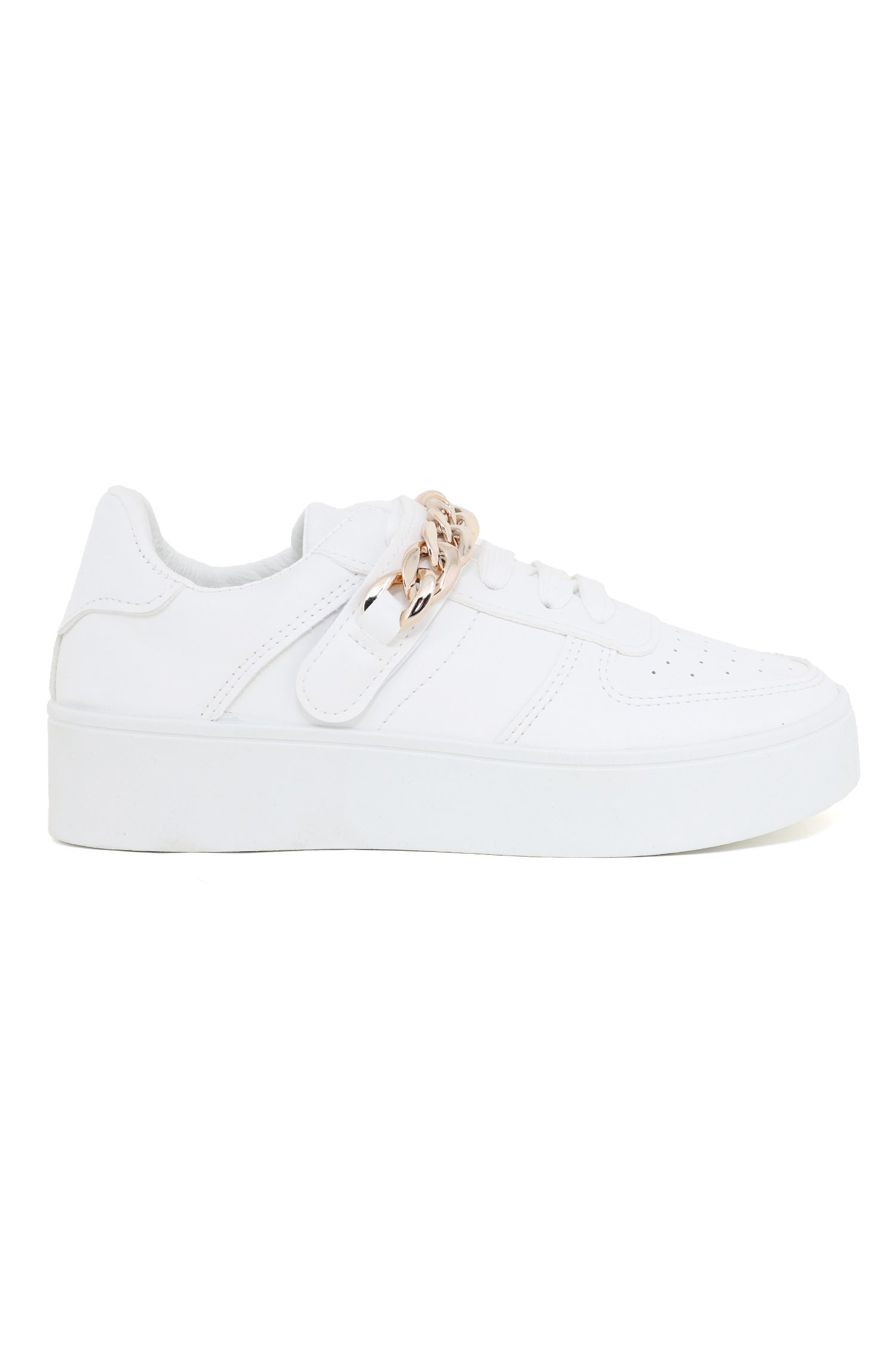 Elevate your sneaker game with these chic white sneakers featuring stylish chain links on the top. Perfect for the modern woman who wants to add a touch of edginess to her casual look, these sneakers are both trendy and versatile.