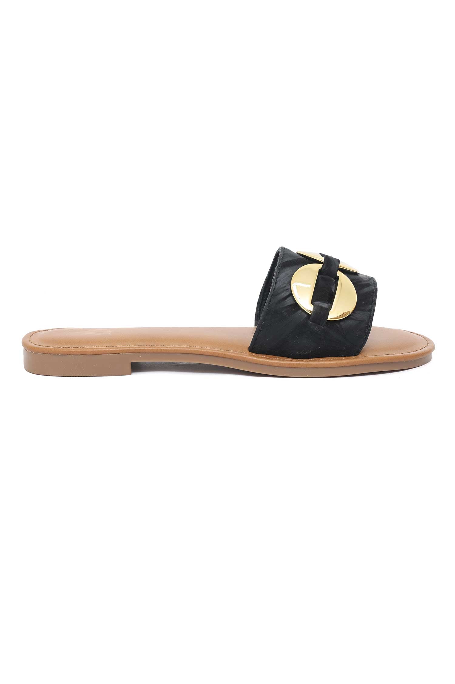 Sleek and sophisticated, these slides feature oversized gold discs for a touch of luxury. Smooth leather-look straps and cushioned footbed ensure all-day comfort. Perfect for effortless summer polish.
