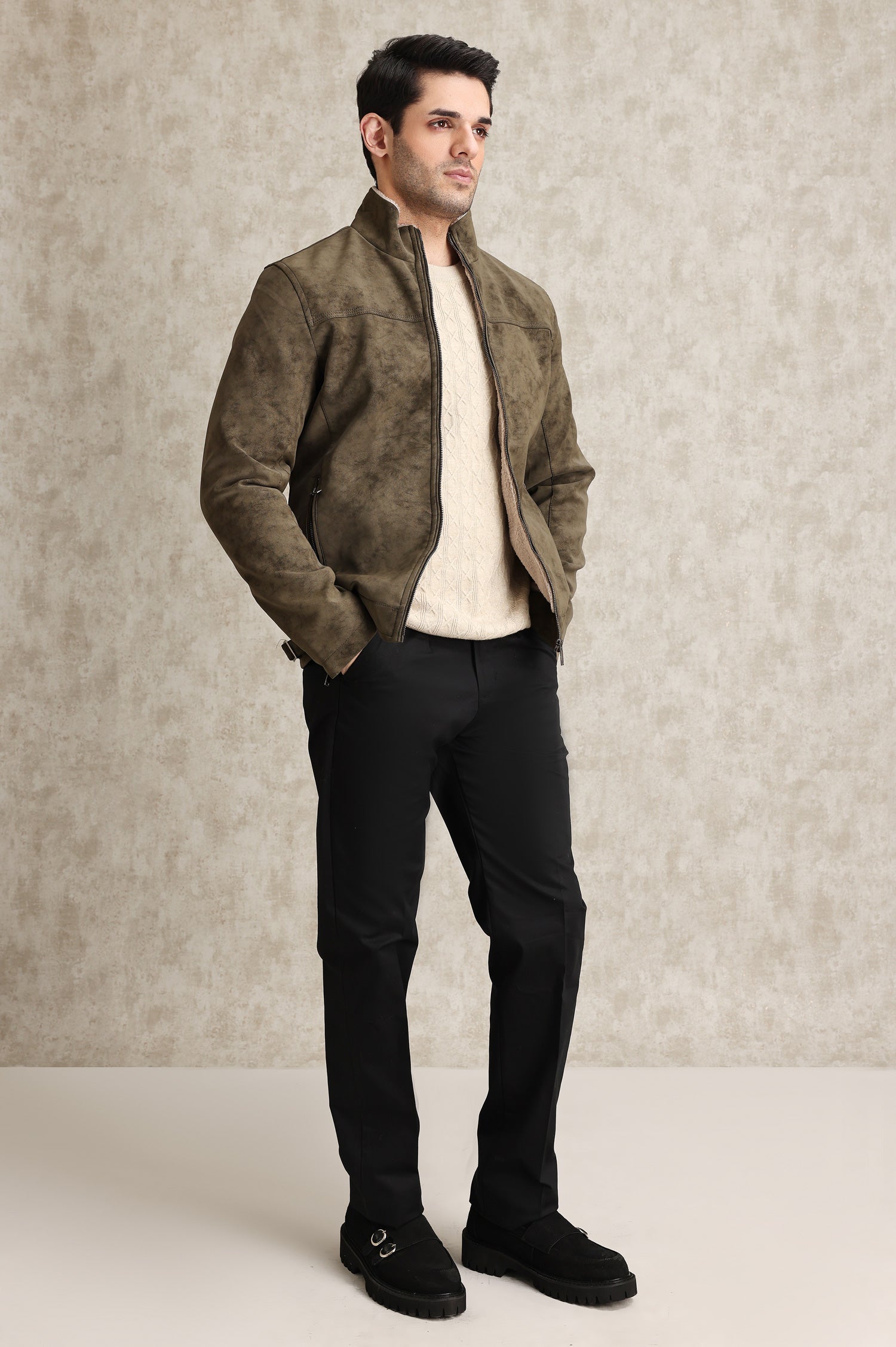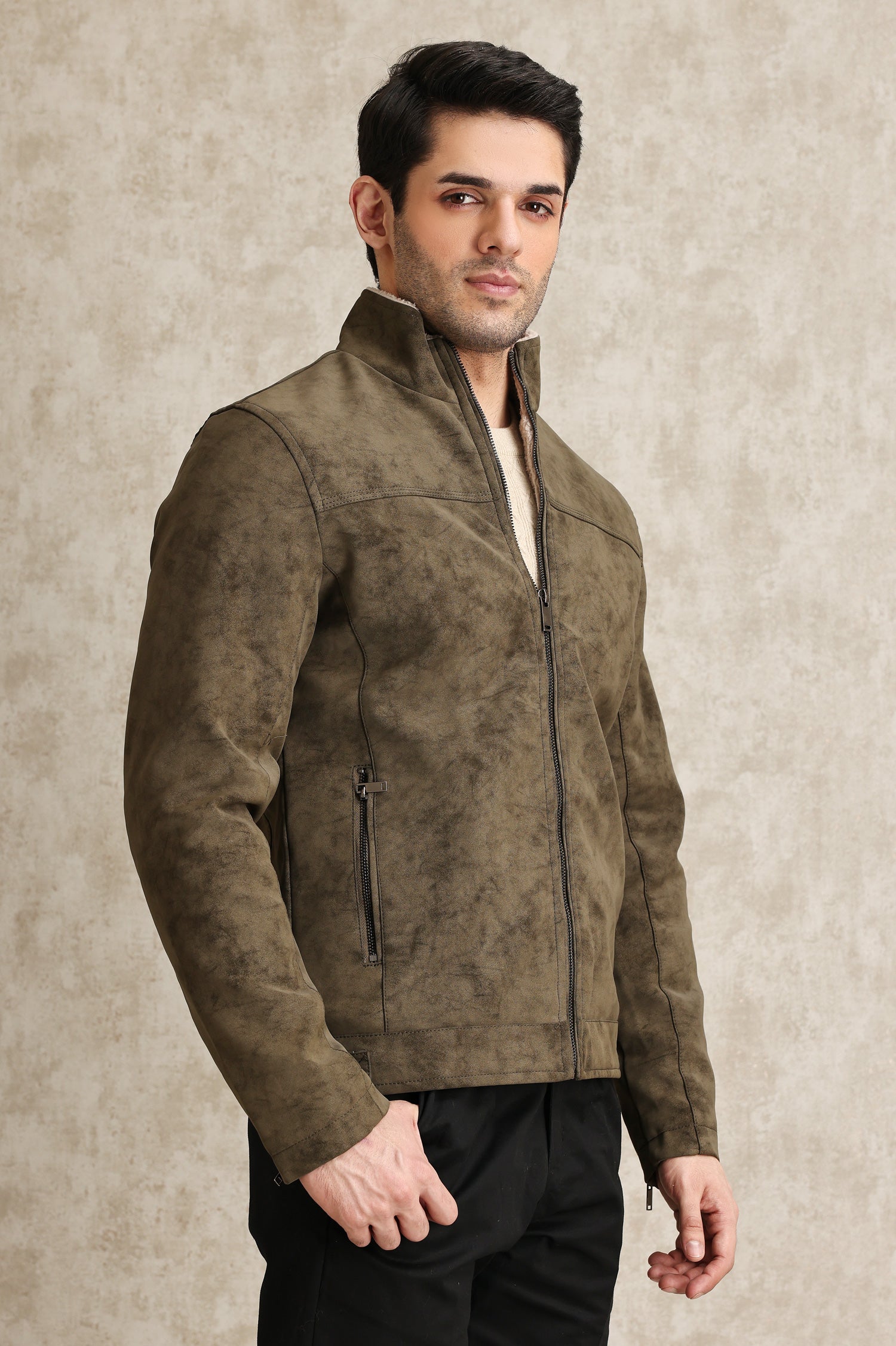 Crafted with premium suede fabric and a soft sherpa lining, this jacket offers ultimate warmth and elegance. Perfect for versatile styling with a sleek zip closure and functional pockets.