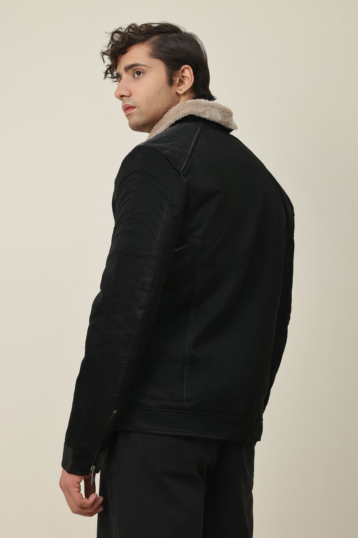 This jacket blends clean biker energy with warmth, featuring a zip front, ribbed hem, and a standout shearling-style collar.