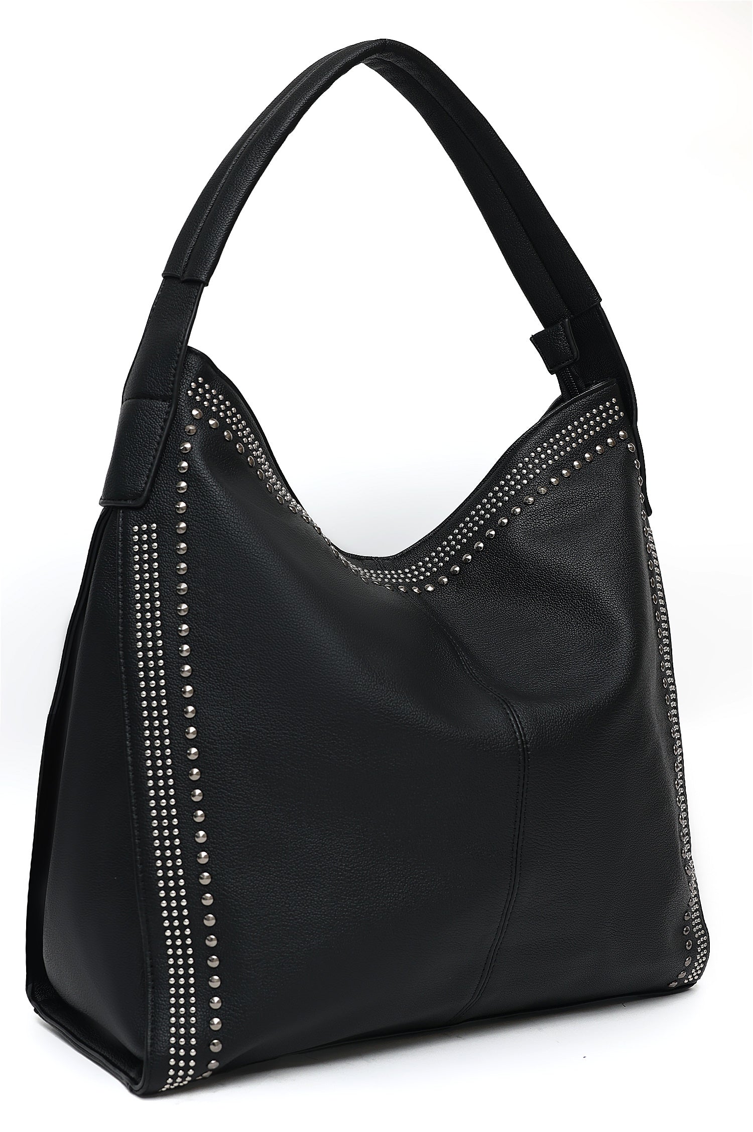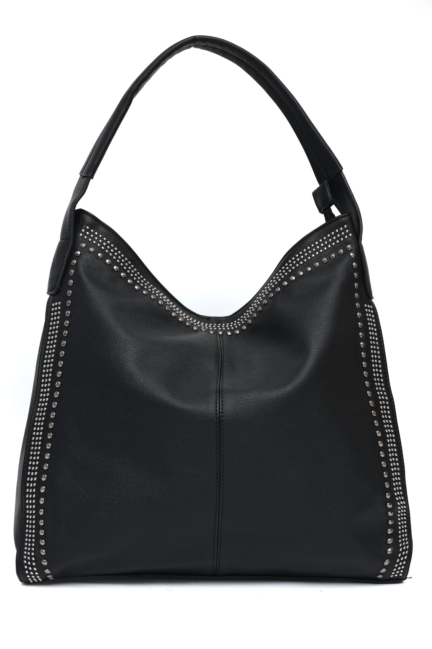 Enhance your style with this Studded Leatherette Shoulder Bag, featuring a chic and modern design adorned with metallic stud details. Crafted from premium leatherette, this bag offers a spacious interior and a comfortable shoulder strap for effortless carrying. A perfect blend of elegance and functionality for everyday use or special occasions.