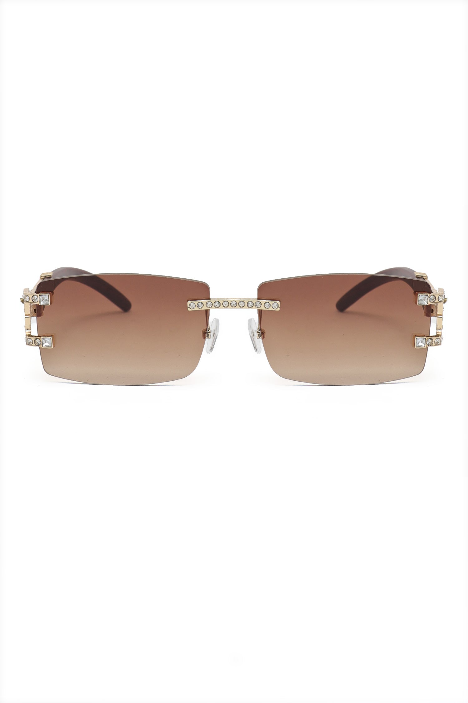 Lightweight rimless sunglasses featuring crystal-encrusted hinges and a jeweled bridge, designed for an opulent yet structured look.