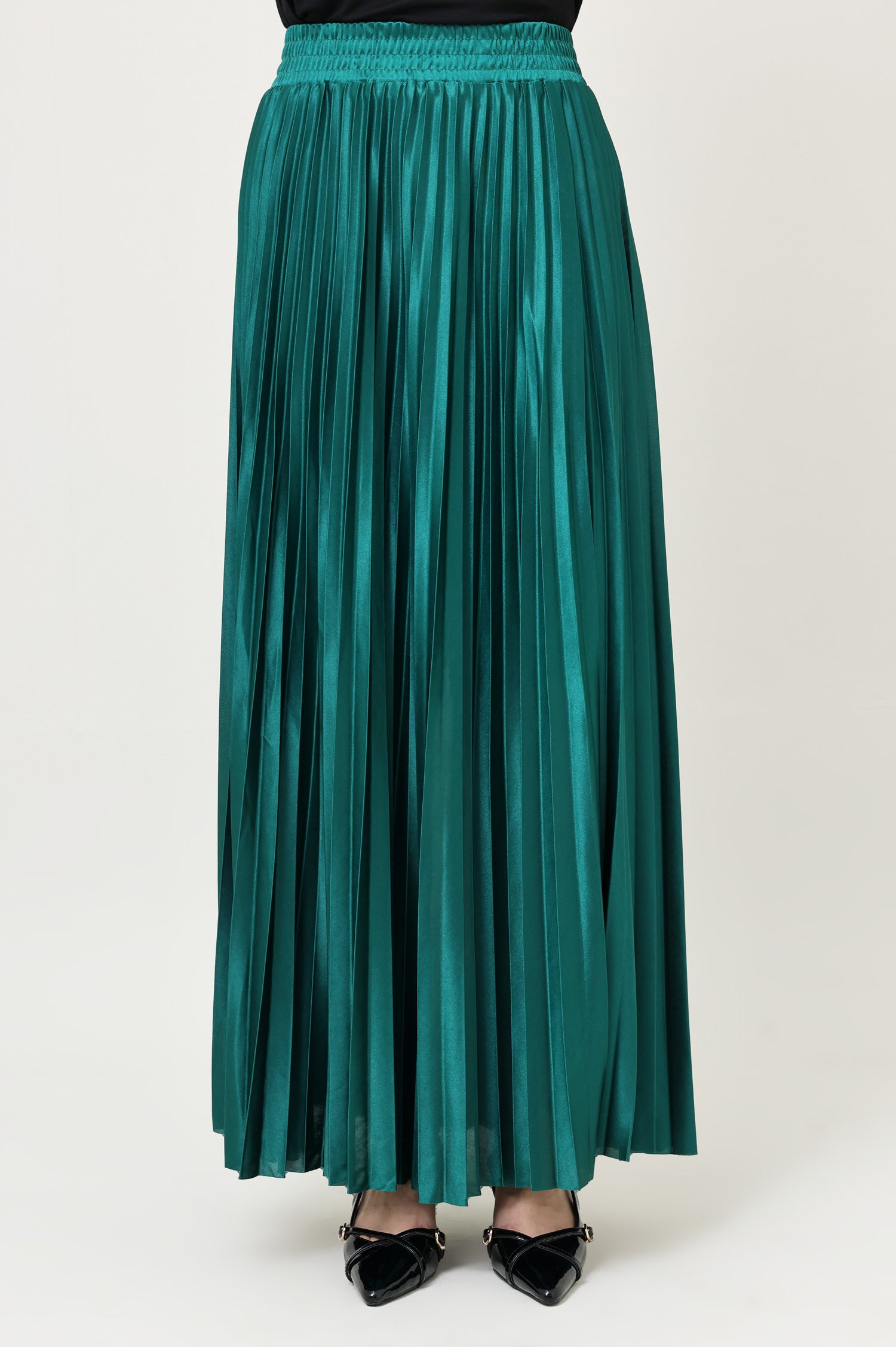 A fluid satin maxi skirt with sharp pleats and a gathered waistband for a flattering fit. its soft sheen and graceful movement add elegance to both casual and elevated looks.