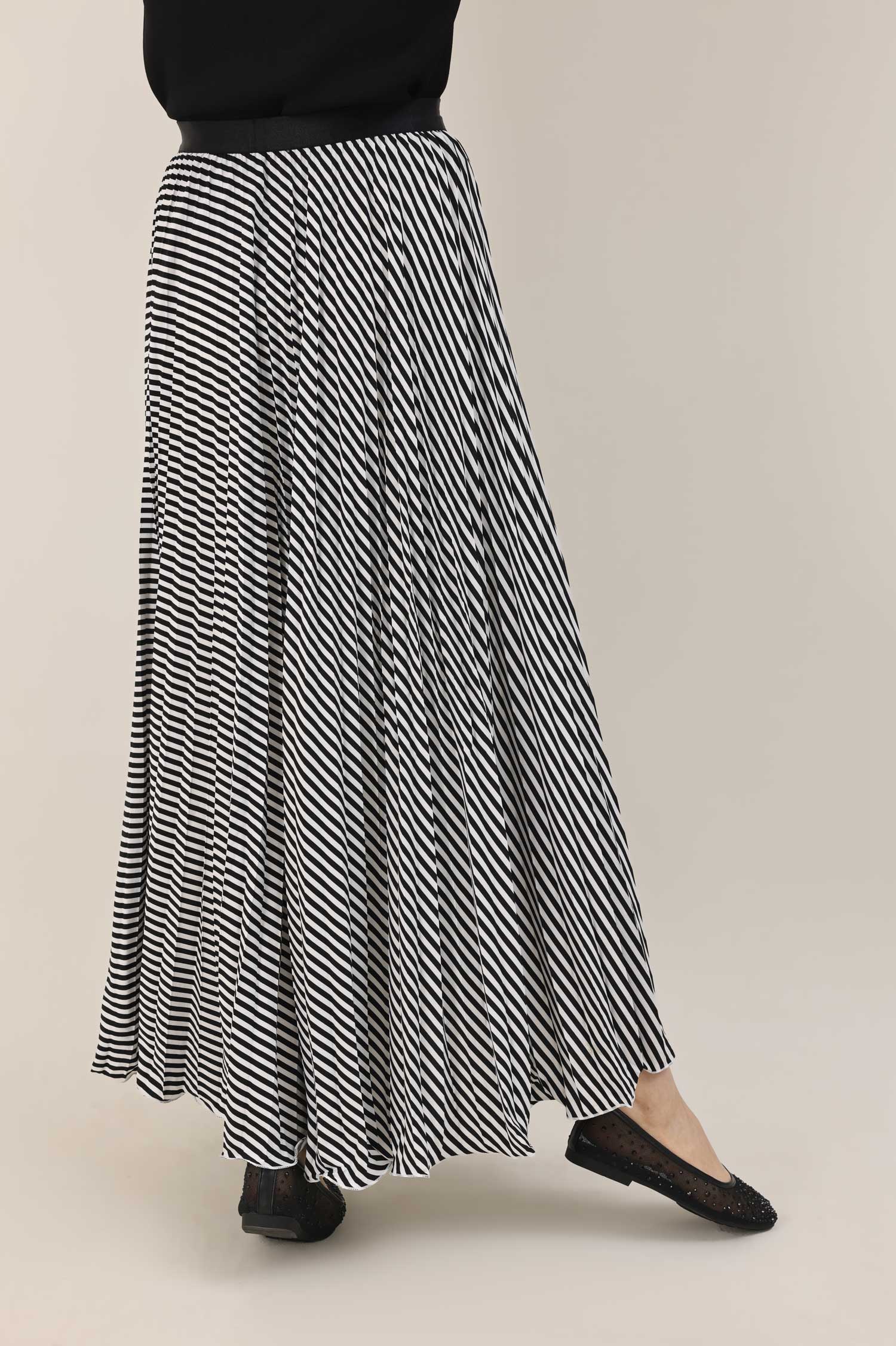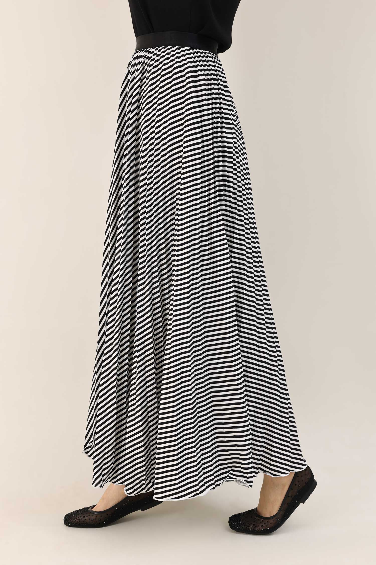 Dramatic sunray-inspired pleats with monochrome flair.