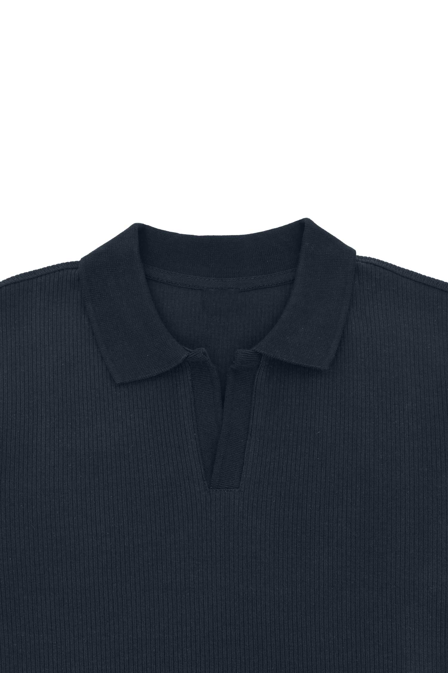 This open-collar knit polo is made from fine ribbed fabric with structured hems. Short sleeves and a stretch-fit body create a tailored casual look. Smart yet relaxed silhouette.