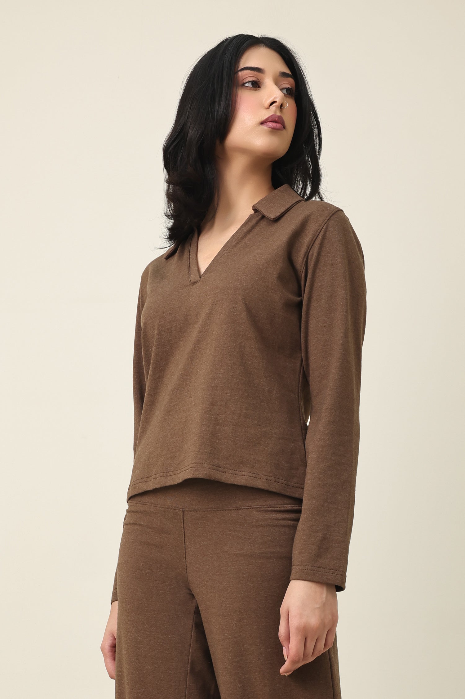 MODERN V-NECK COLLAR TOP-CHOCOLATE