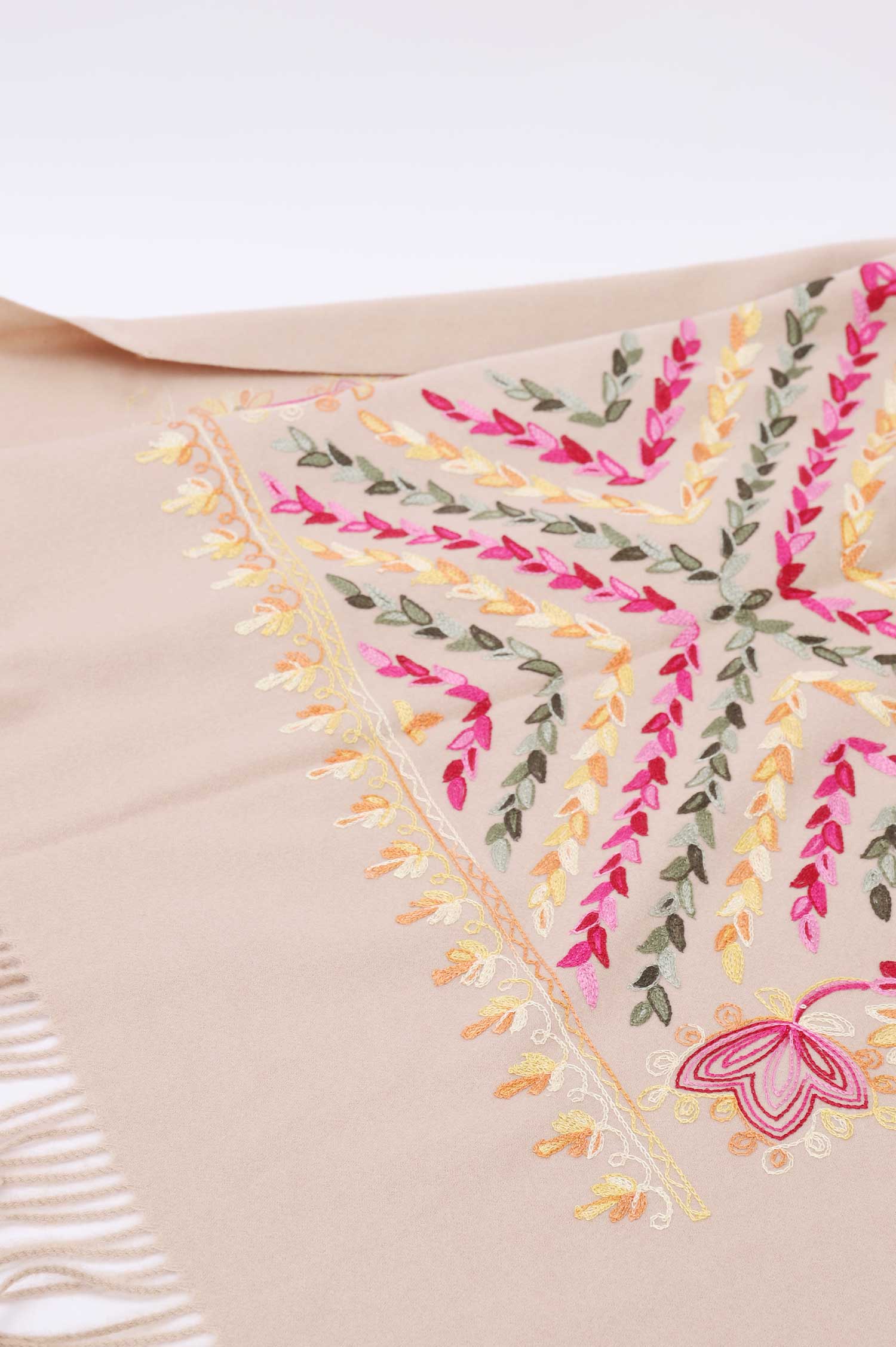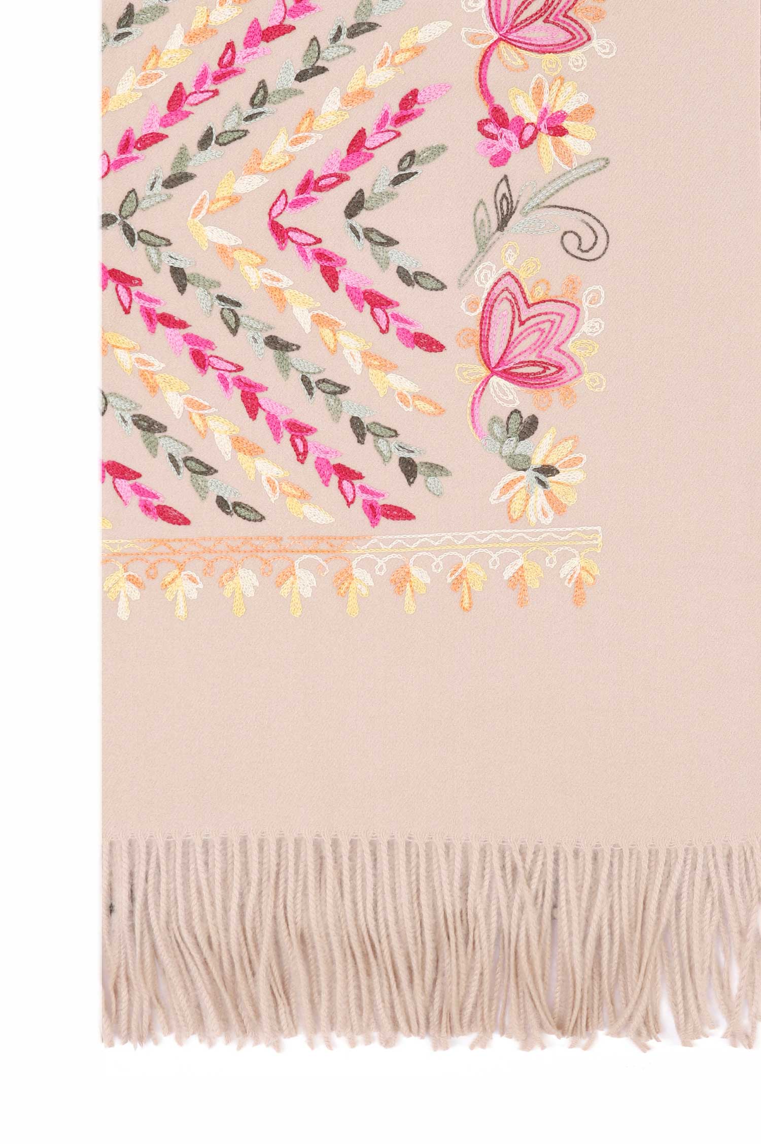 Floral embroidery woolen shawl showcasing a multi color-blend of embroidery.