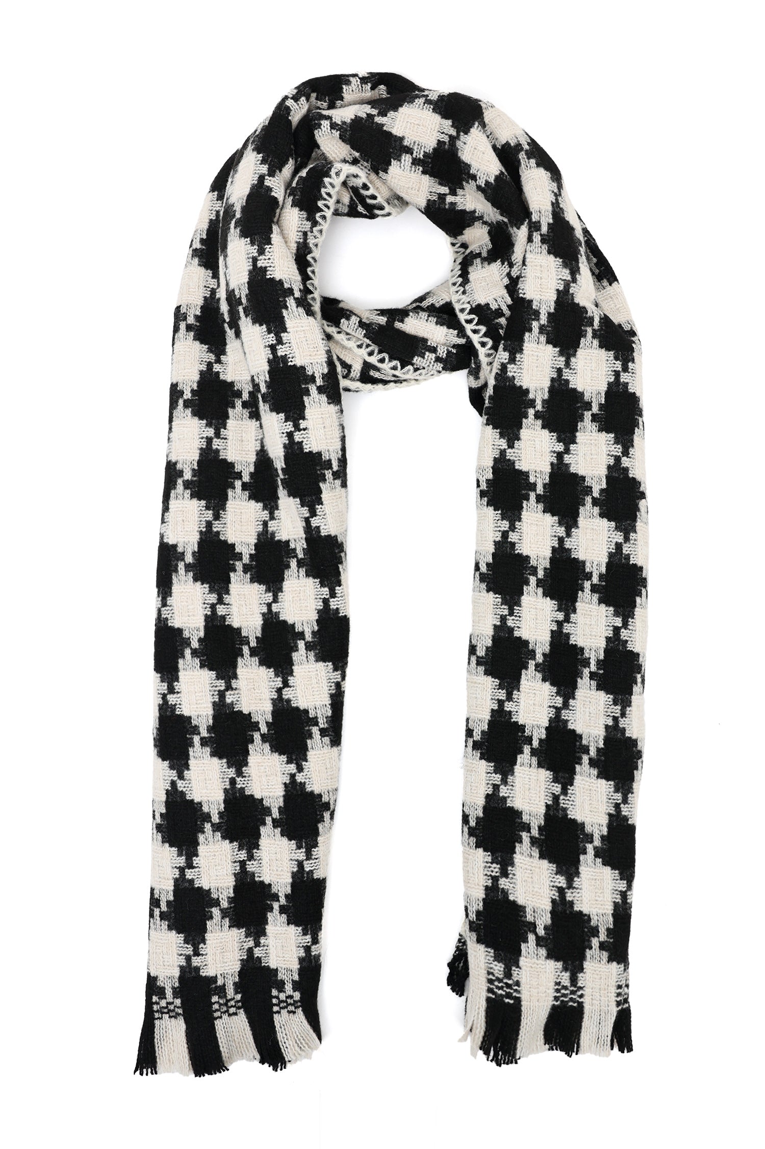 Elevate your style with this classic houndstooth patterned scarf. Crafted from soft and cozy fabric, it combines timeless elegance with a modern edge. The intricate design and subtle fringe detailing make it a versatile accessory for any occasion. Perfect for adding a touch of sophistication to your wardrobe.