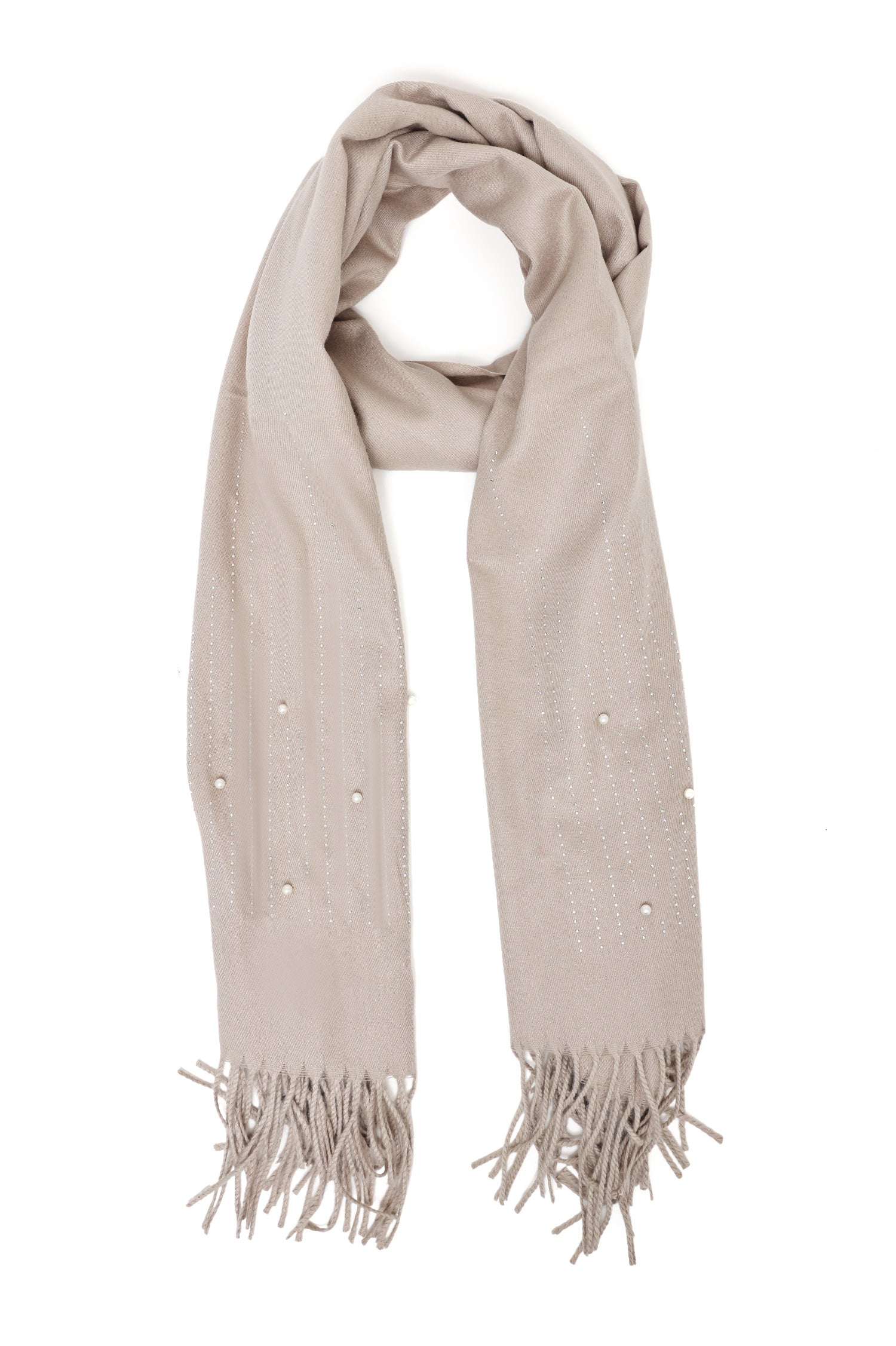 Add a touch of elegance to your wardrobe with this soft woolen scarf featuring delicate pearl and stud embellishments. Designed with fringed edges for a sophisticated finish, it provides a perfect blend of comfort and style, ideal for any occasion.