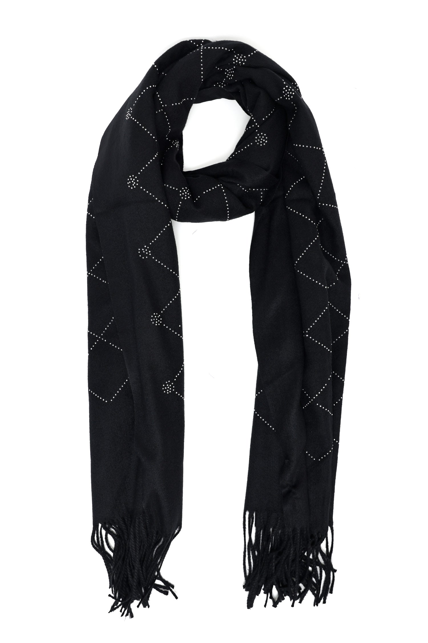 This woolen scarf boasts a sophisticated geometric studded design, offering a perfect blend of style and functionality. Made from premium-quality wool, it ensures warmth and comfort, making it an ideal accessory for chilly days and elegant evenings.
