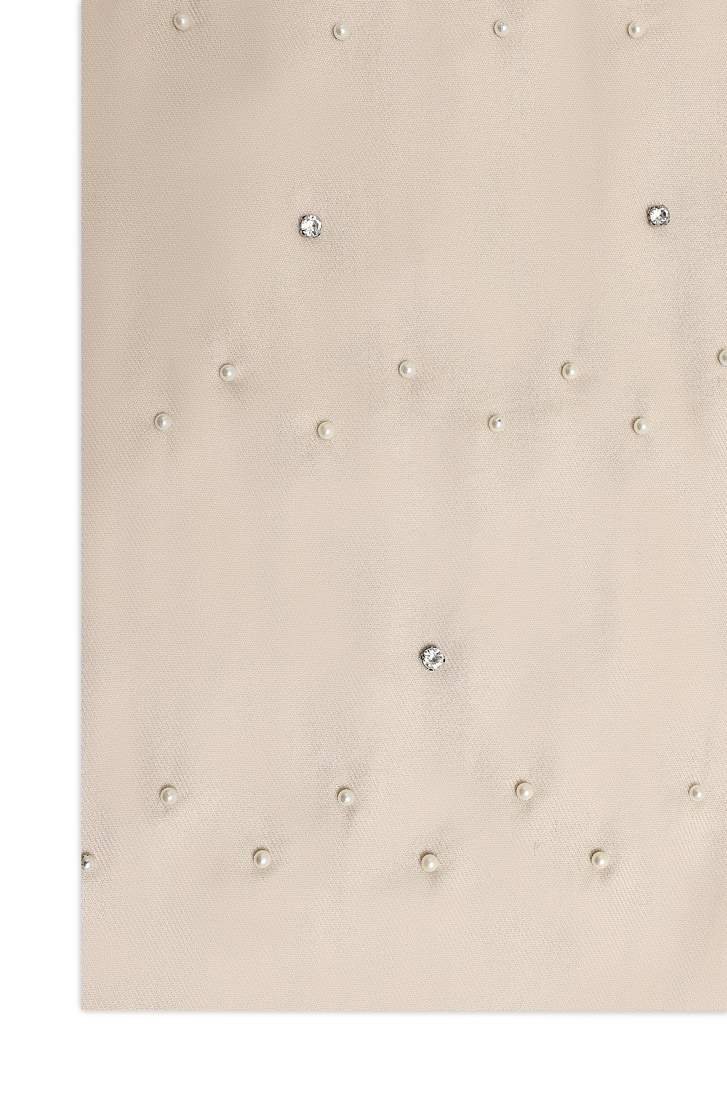 Glistening accents fall across a smooth matte-sheen backdrop. The pearl-stud layout offers just the right hint of glamour. Finished with finely knotted fringe edges.