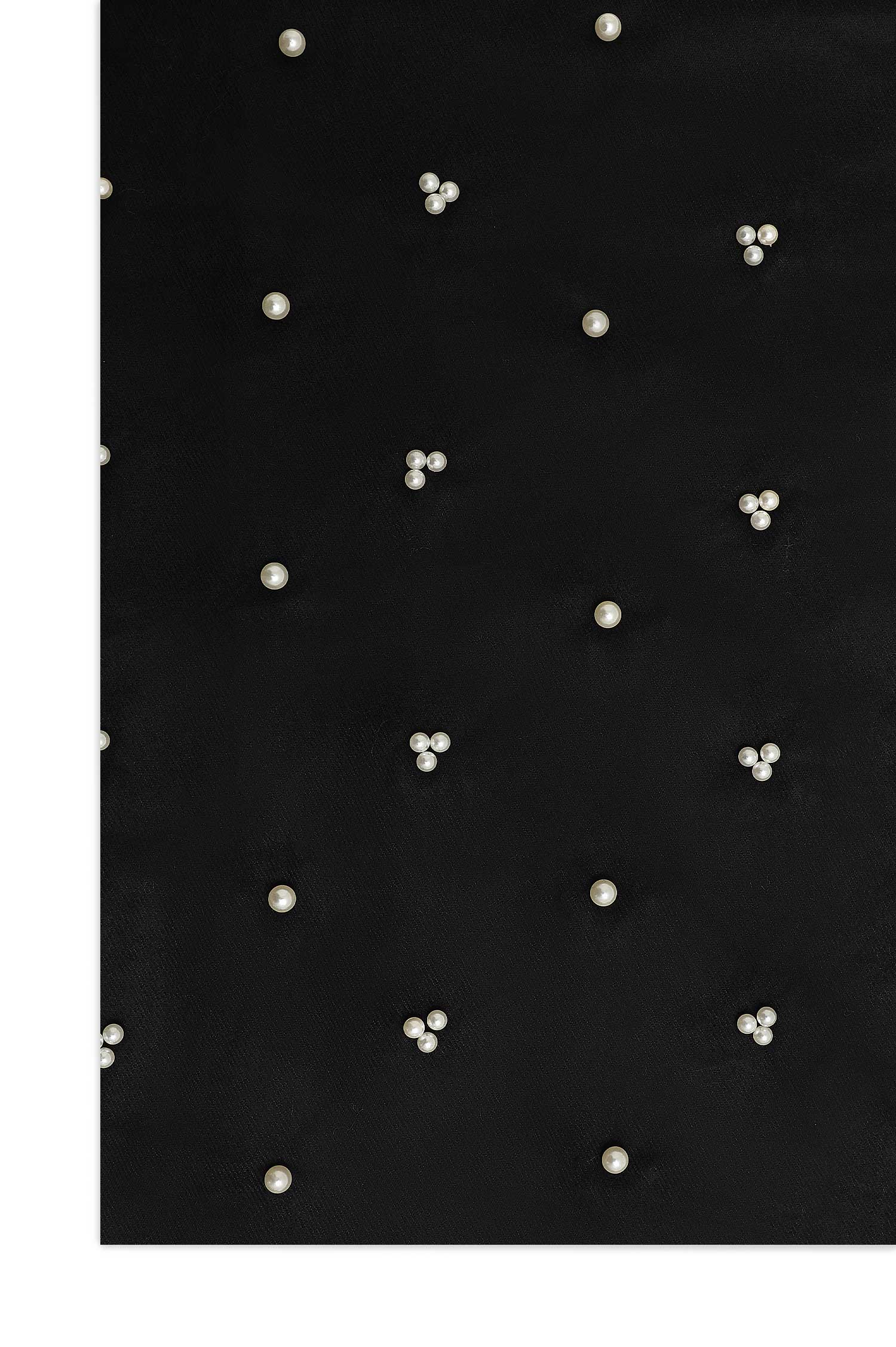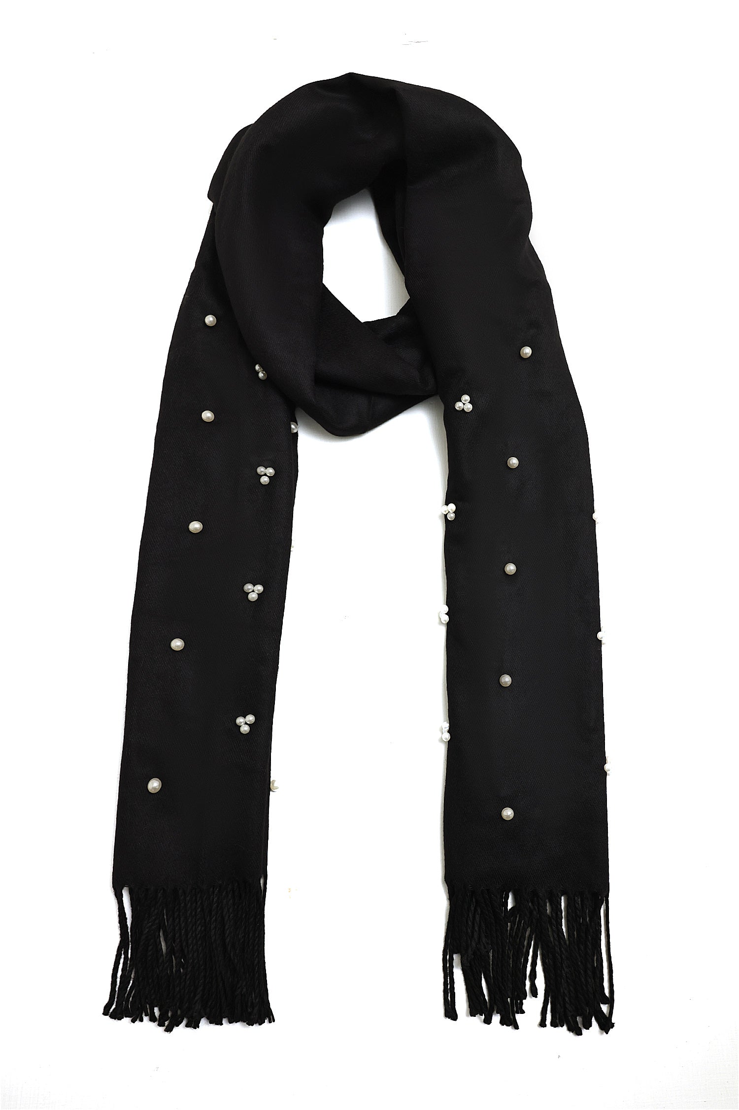 Fine sparkle from pearl and rhinestone embellishments makes this scarf quietly radiant. Delicate fringe complements the lightweight silhouette. A serene and polished accessory.