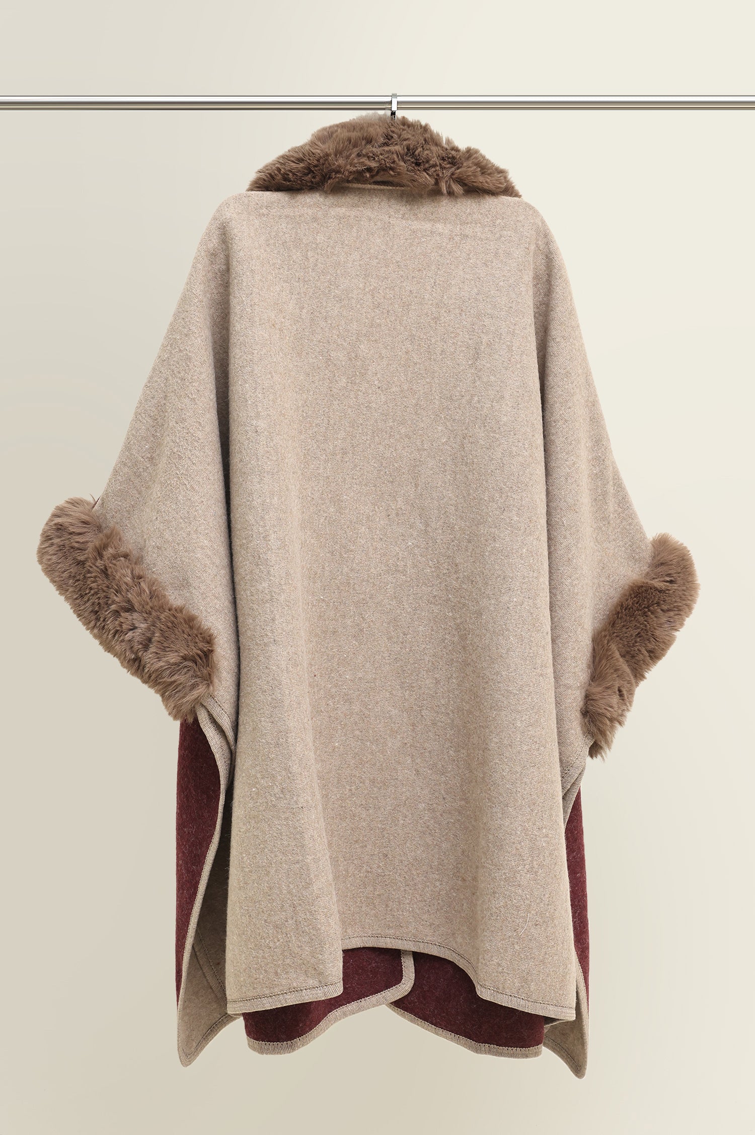• Design: The wrap features a color block design in beige (or taupe) and burgundy (or maroon), with plush brown faux fur trim on the collar and cuffs.