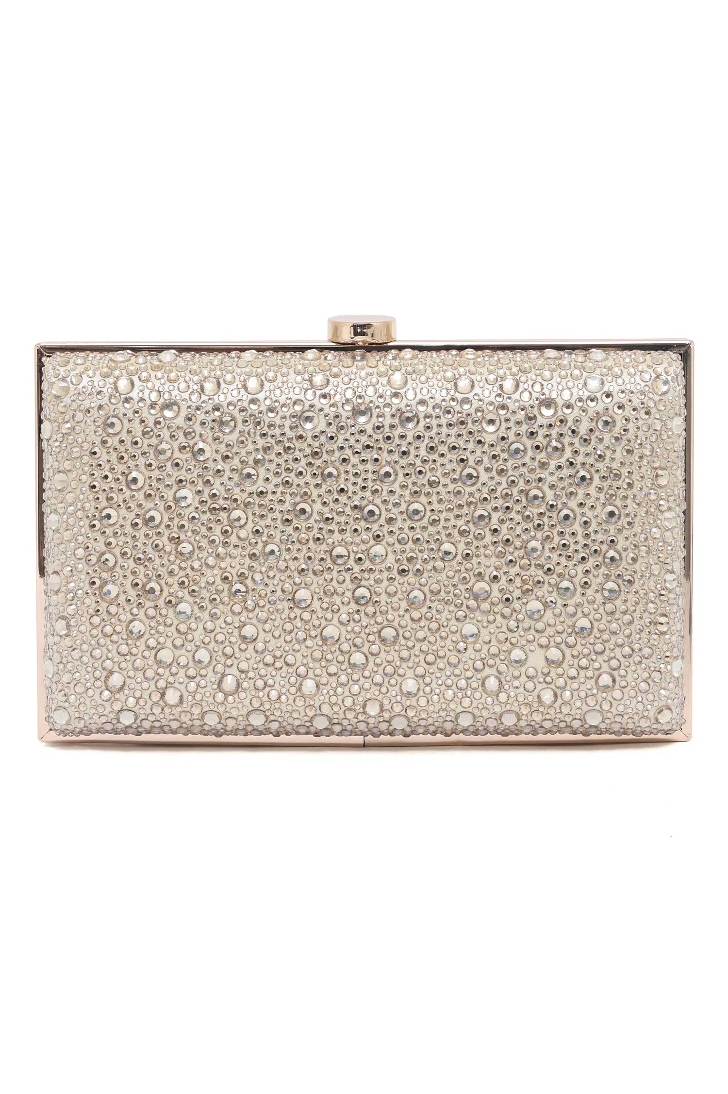 Dazzling clutch adorned with intricate crystal embellishments and a chic metallic frame. Comes with a detachable chain strap for versatile styling. Perfect for glamorous evenings.