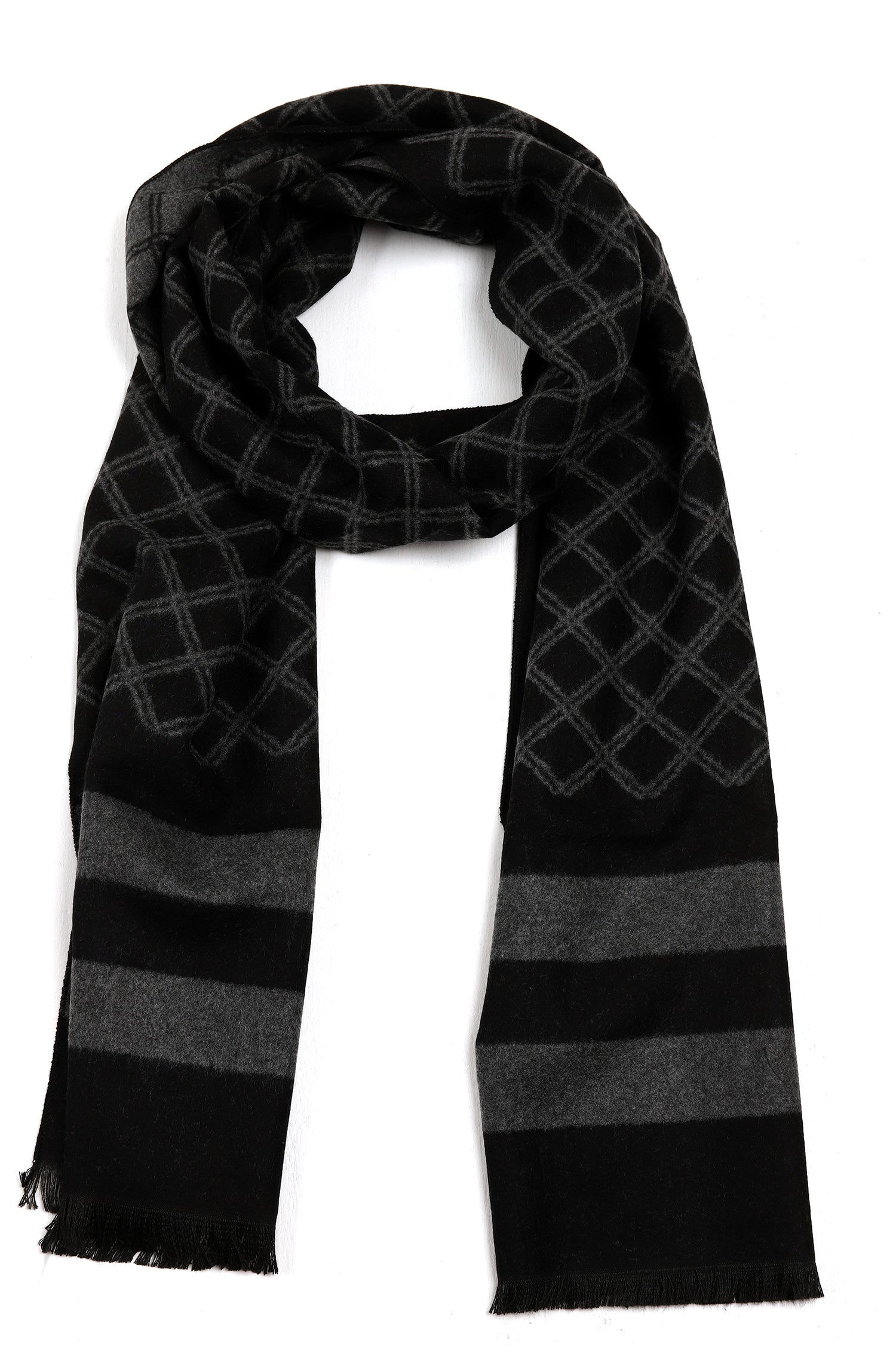 Knitted scarf showcasing a checkered pattern along with striped border and frayed hem.