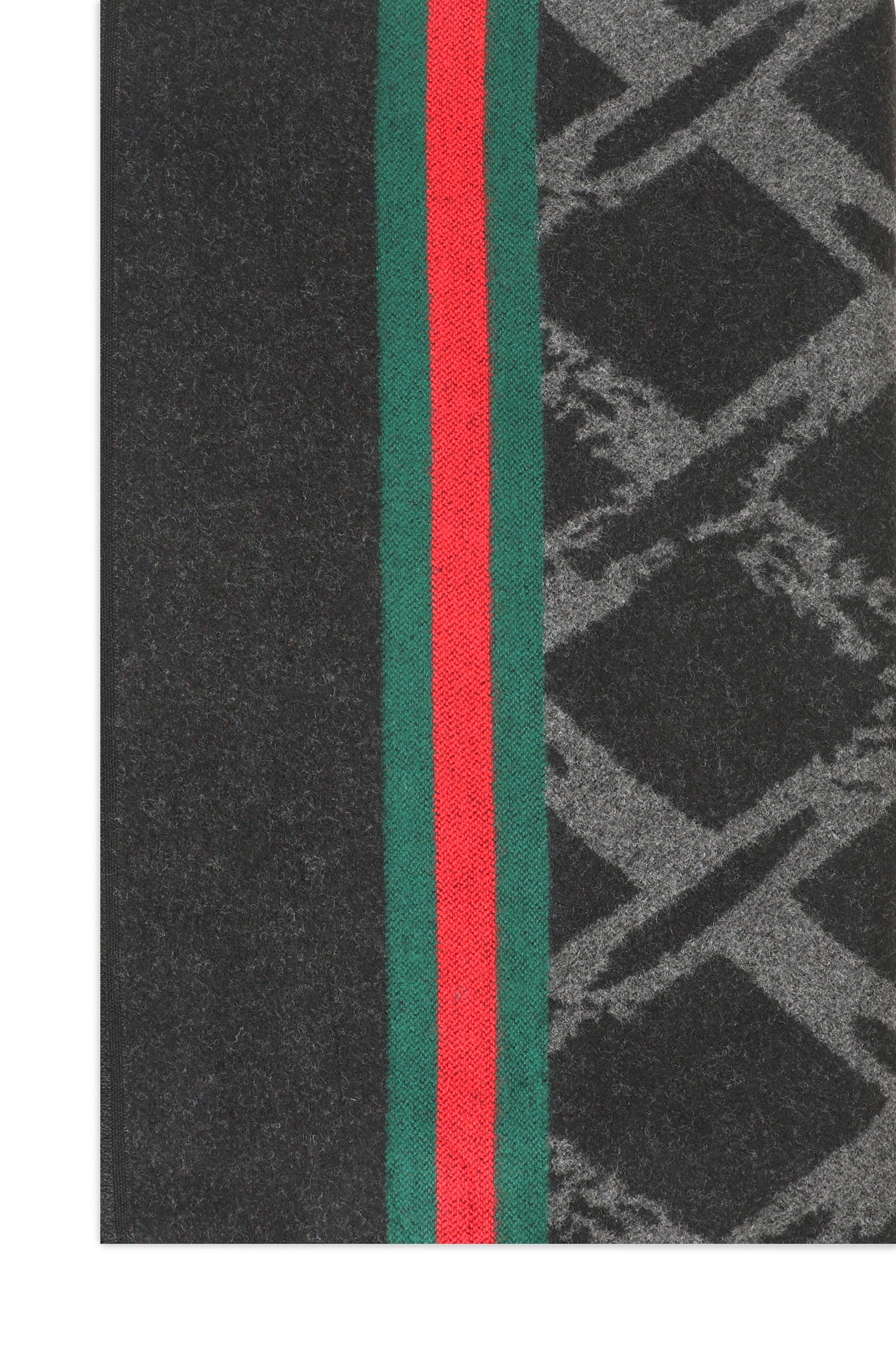 Our take on the winter shades through a woolen knit scarf with a unique brush stroke design, bold green/red striped borders and frayed hem.