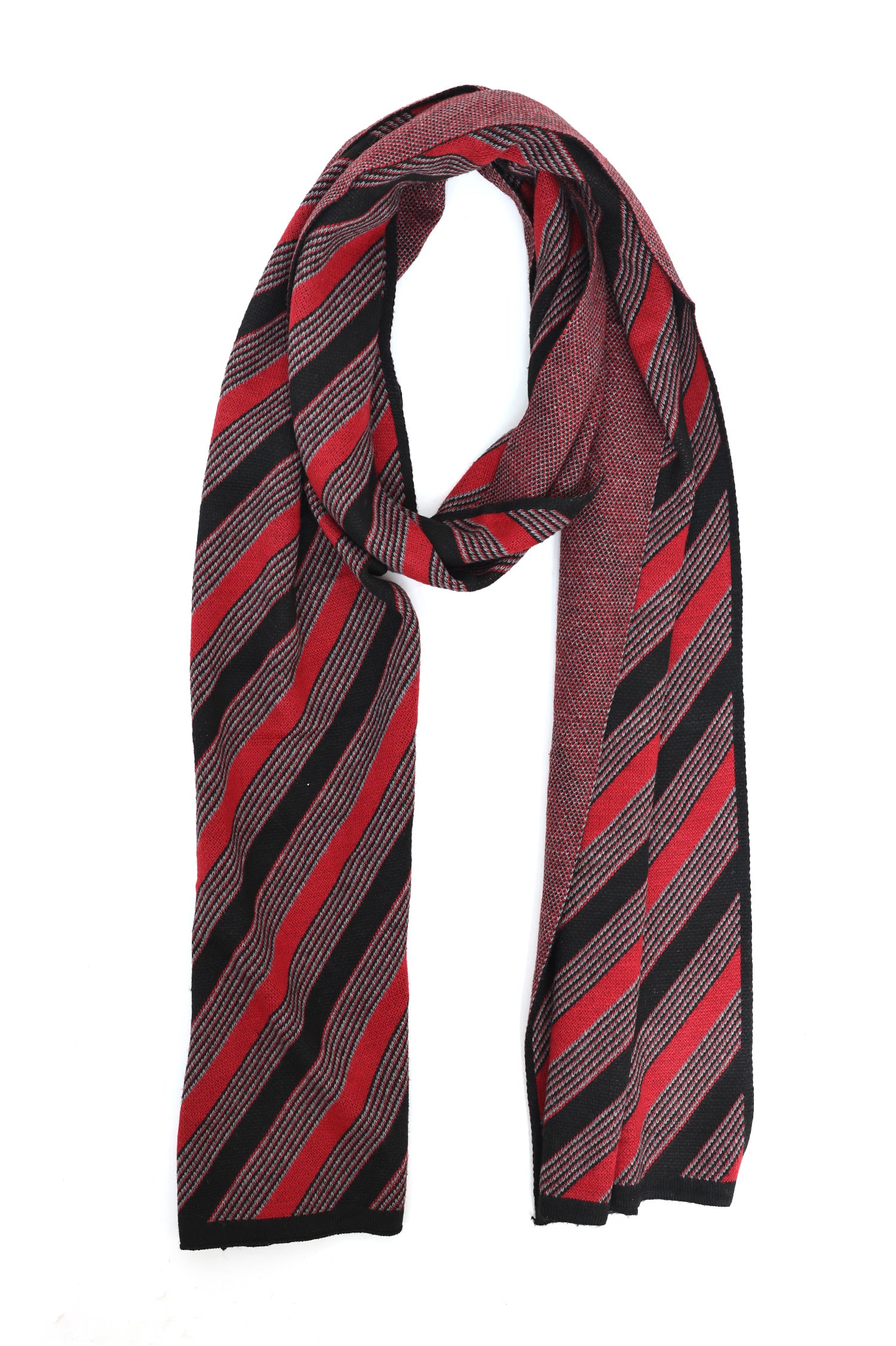 A vibrant knit scarf featuring bold diagonal stripes and intricate woven details. Designed for both warmth and style, it adds a dynamic, modern touch to any outfit.