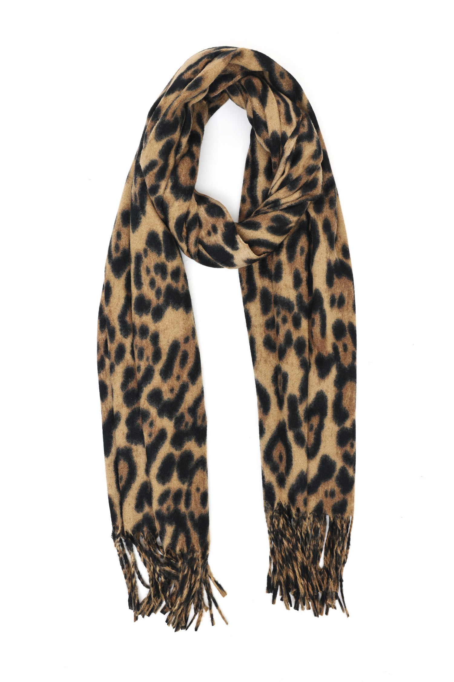 A stylish scarf featuring a bold leopard print design with soft fringed edges. Cozy and chic, it adds a statement-making touch to any outfit.