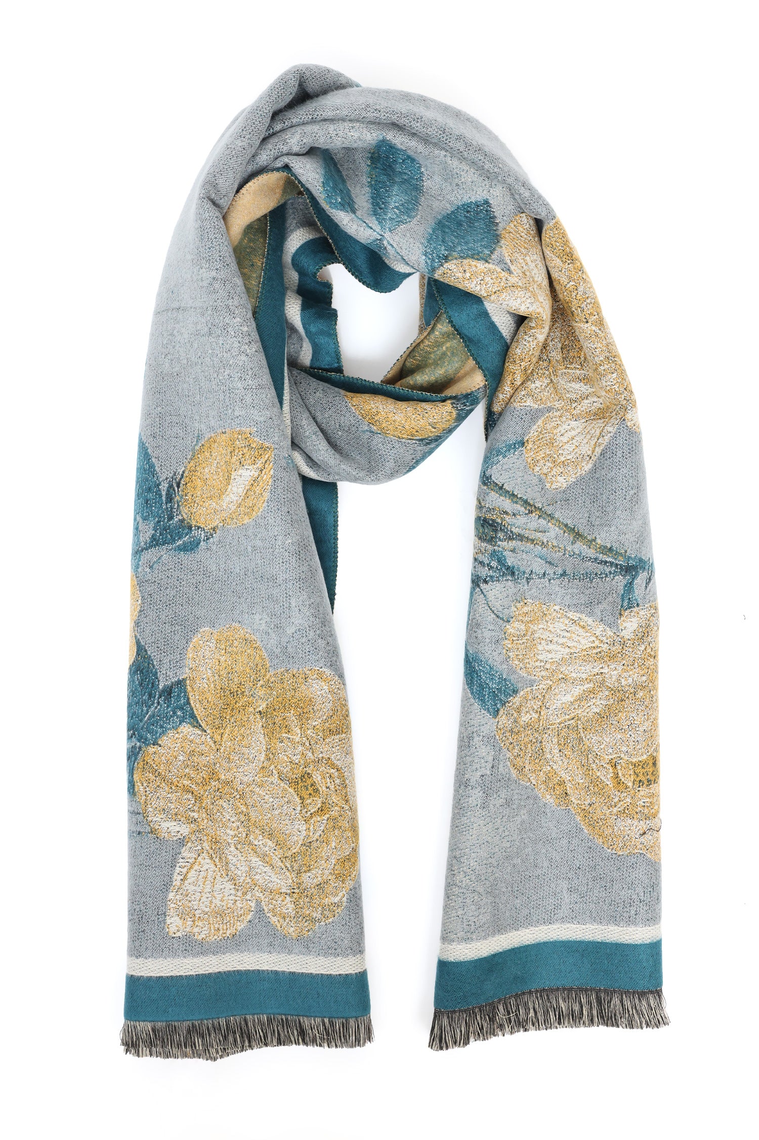 An exquisite scarf featuring golden floral accents against a soft gray base with teal highlights. The intricate design and delicate fringe bring an elegant touch, perfect for adding sophistication to any outfit. A timeless accessory for all seasons.