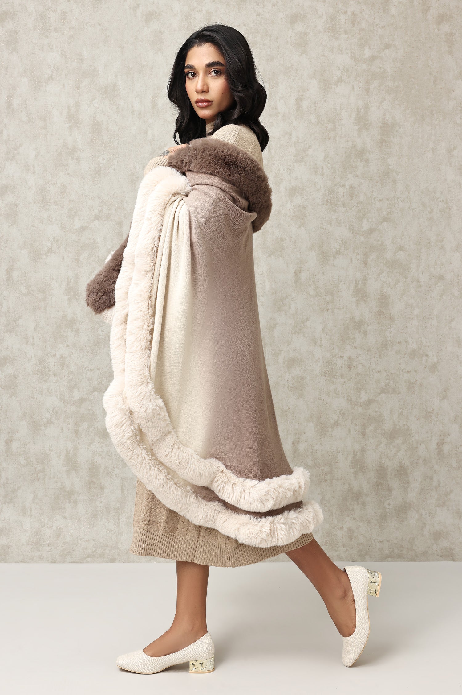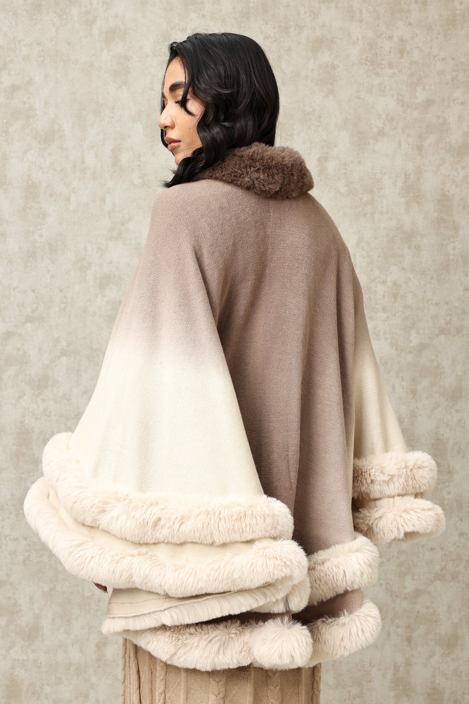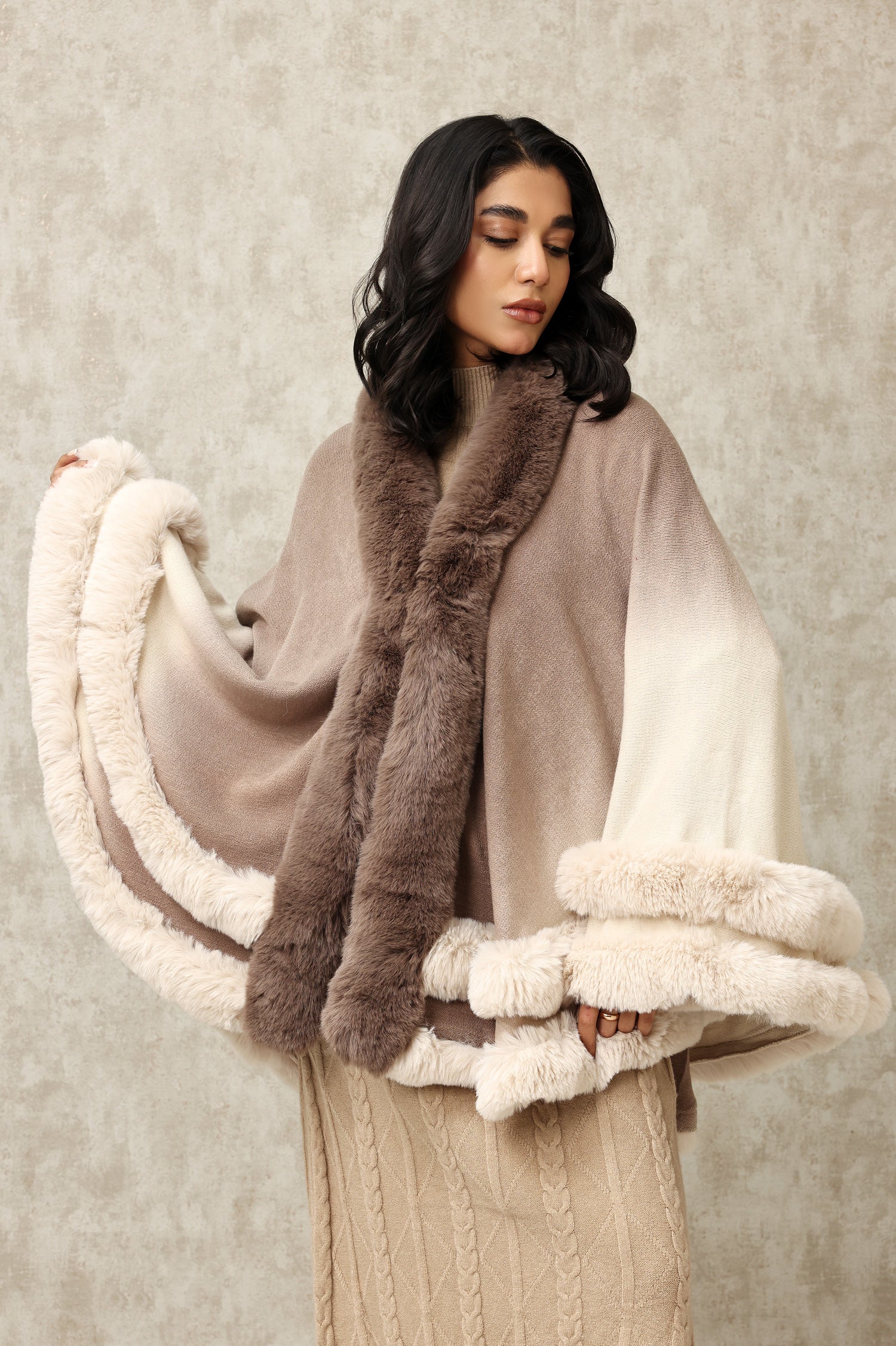 crafted with elegance, this luxurious cape features a flowing silhouette complemented by tiered fur trim accents and a soft textured fabric. the structured design and intricate detailing make it a perfect layering piece for statement styling.