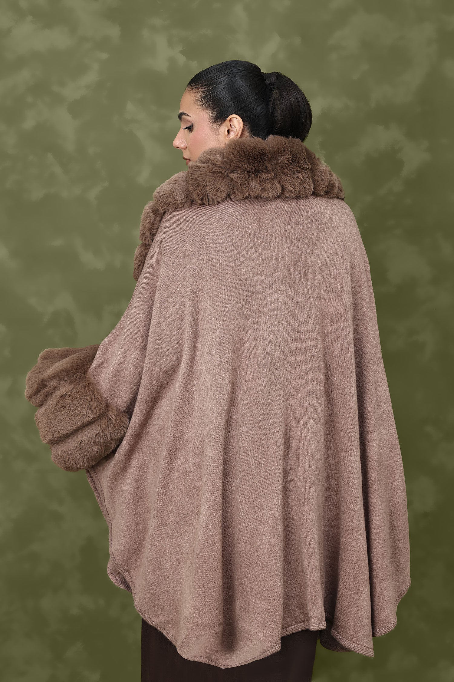 Layered faux fur panels on sleeves and a voluminous shawl collar.