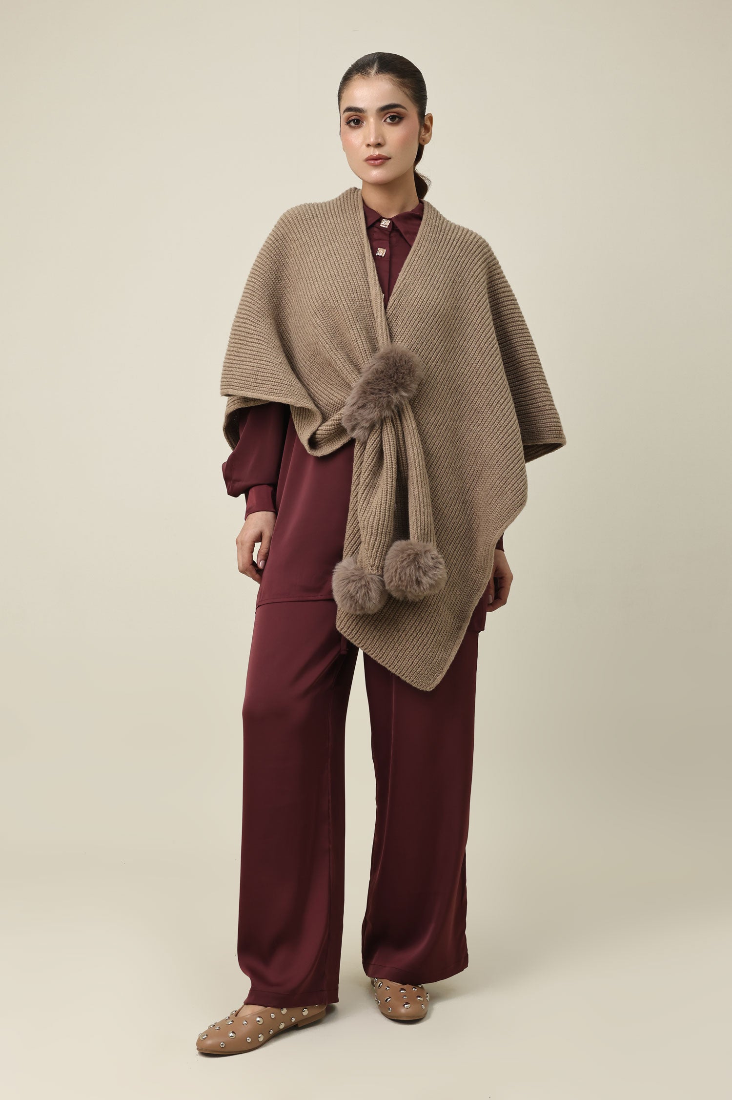 Detailed with voluminous faux fur pom tassels at edges.