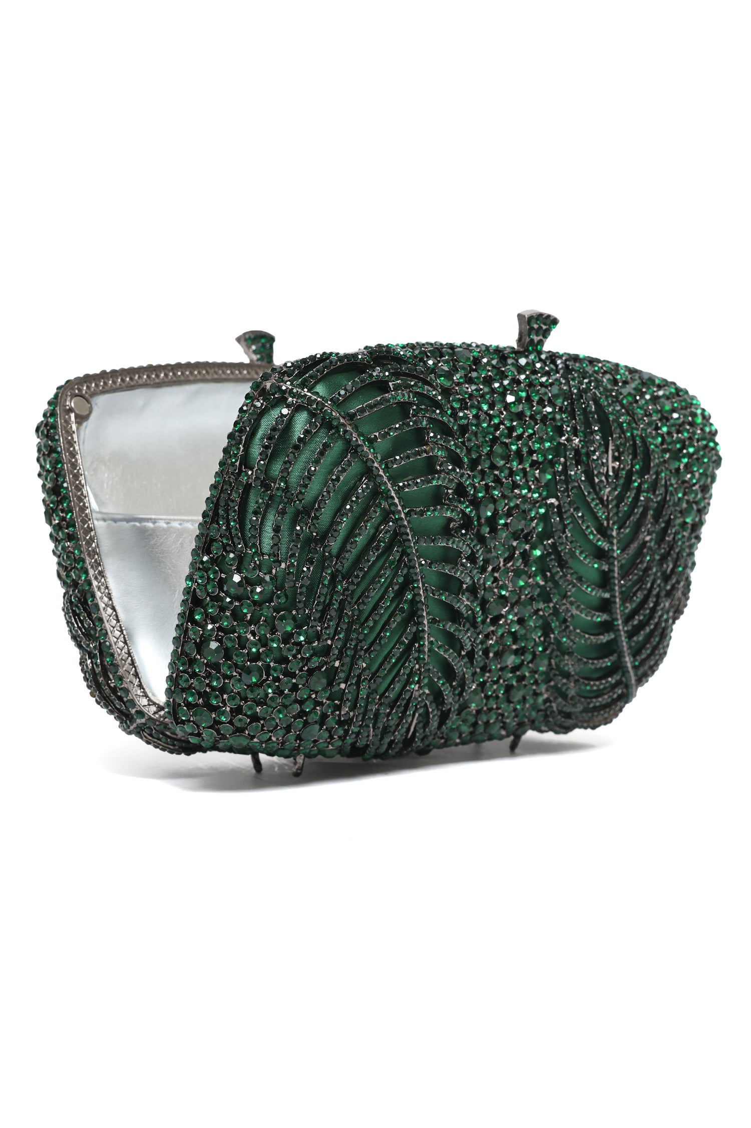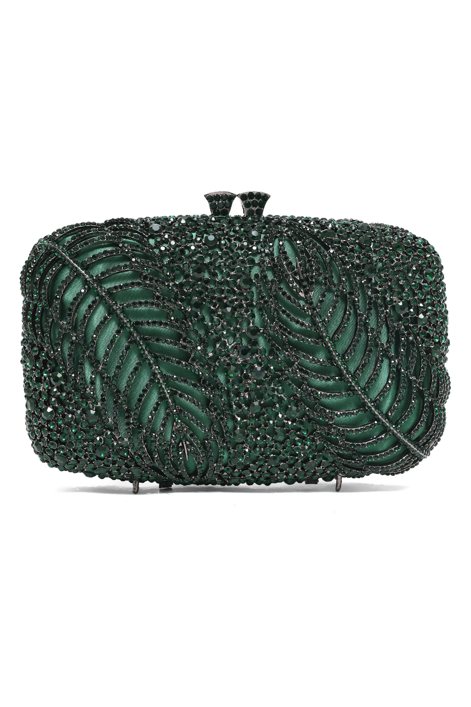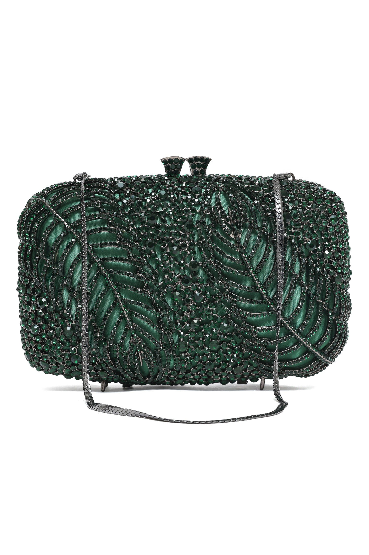 This rectangular clutch showcases intricate leaf motifs encrusted with shimmering embellishments, exuding elegance and sophistication. The compact design is complemented by a secure clasp closure and a versatile detachable chain, perfect for evening events or glamorous outings.