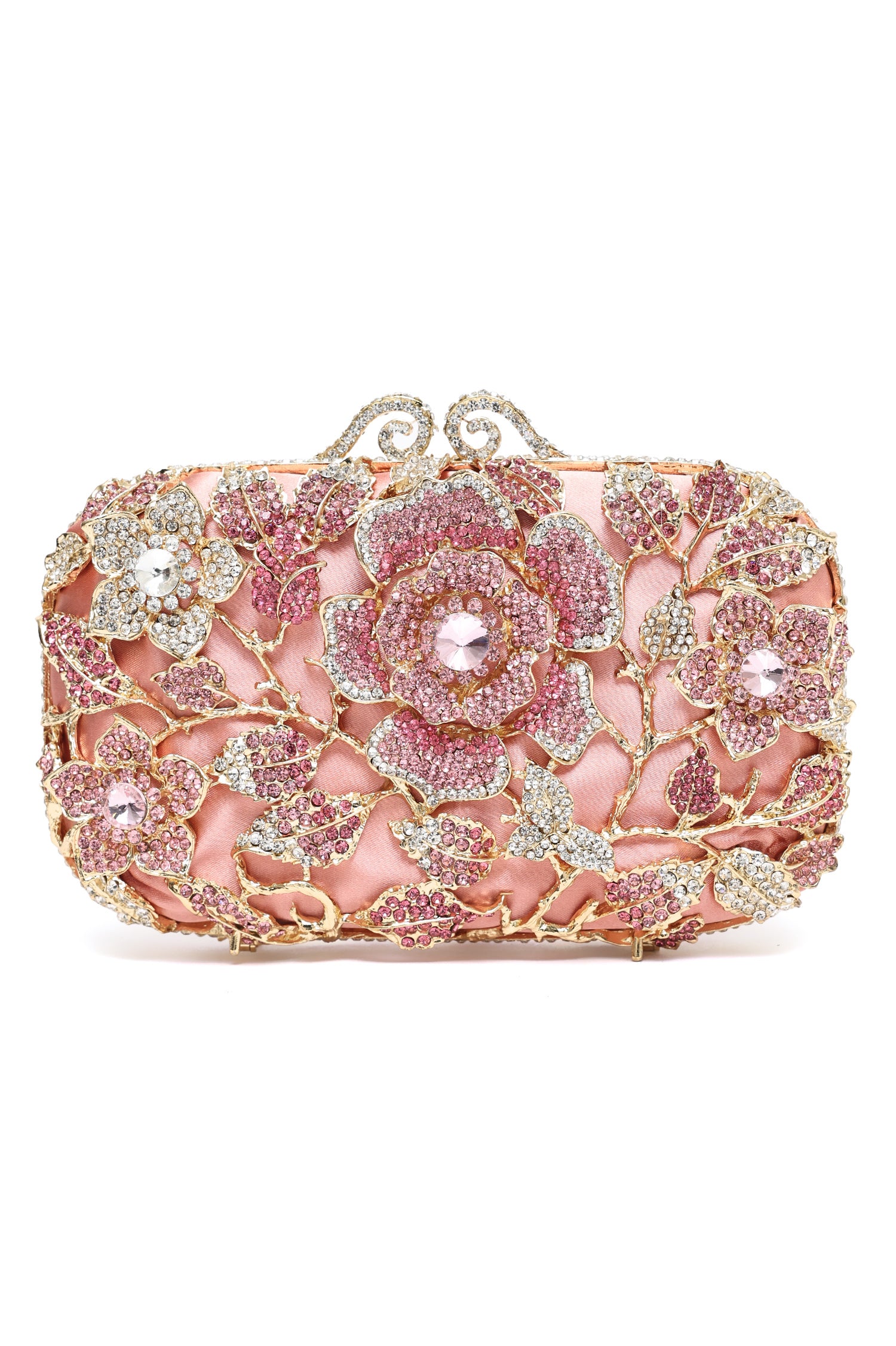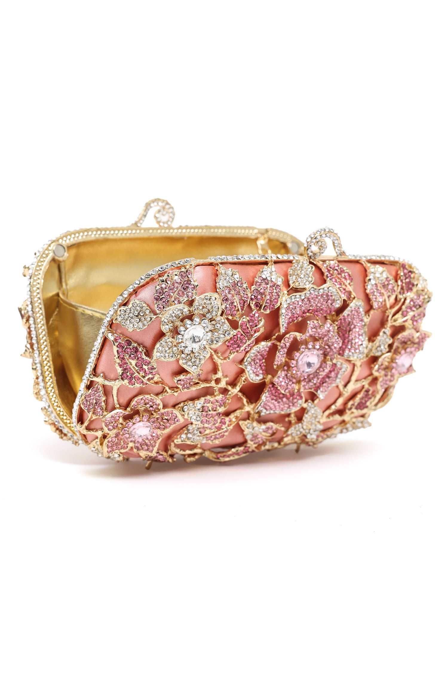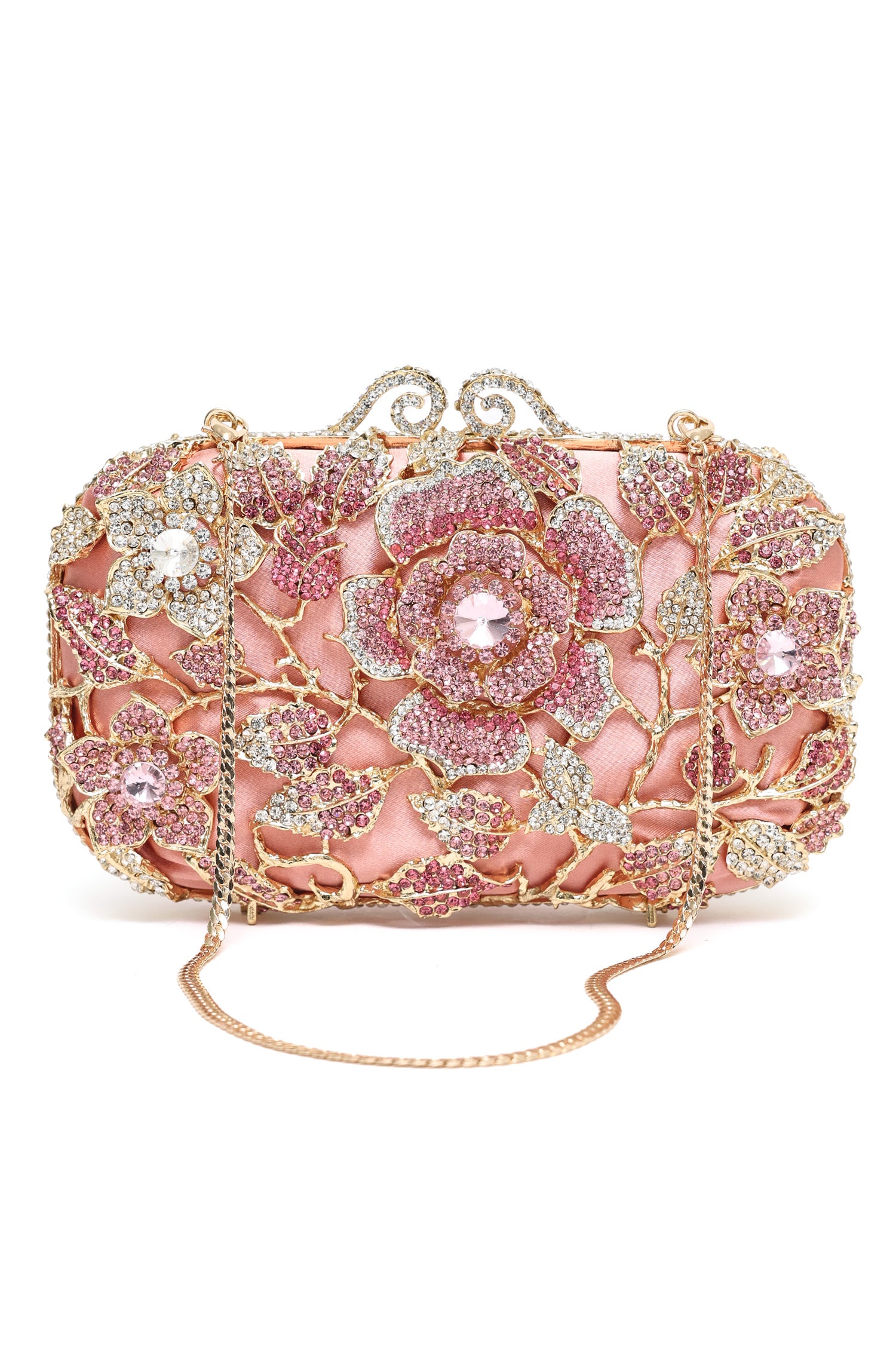 Luxurious clutch adorned with intricate floral crystal designs and a chic metallic frame. Comes with a delicate chain strap for versatile styling. Perfect for weddings and evening occasions.
